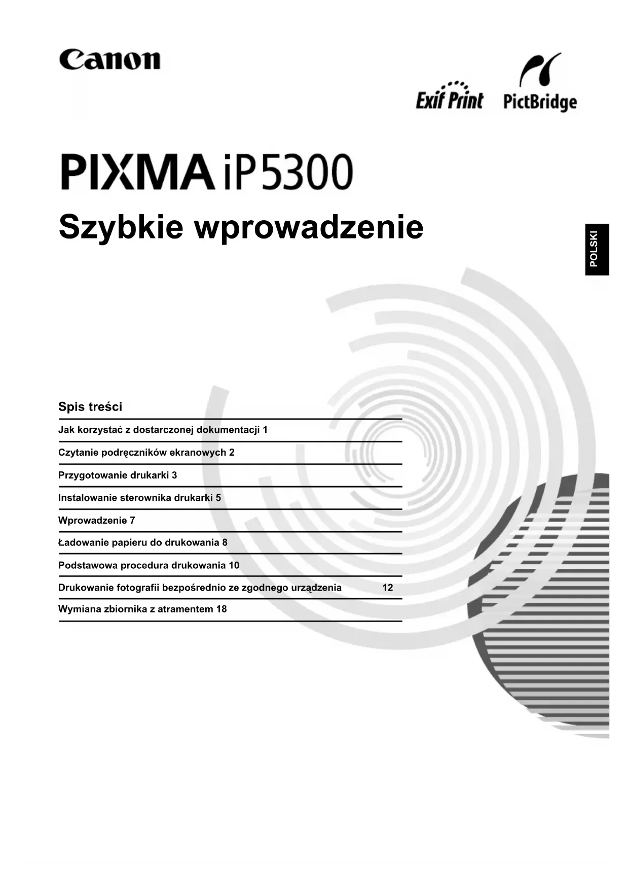 Nie naleĪy korzystaü ze Ĩródáa zasilania o napiĊciu innym niĪ napiĊcie stosowane standardowo w kraju zakupu. UĪycie zasilania o niewáaĞciwym napiĊciu bądĨ czĊstotliwoĞci grozi poĪarem lub poraĪeniem prądem. z WtyczkĊ naleĪy zawsze wkáadaü do gniazda do koĔca. Przestroga z Ze wzglĊdów bezpieczeĔstwa zbiorniki z atramentem powinny byü przechowywane w miejscach niedostĊpnych dla maáych dzieci. z Nie upuszczaü zbiorników z atramentem ani nie wstrząsaü nimi, poniewaĪ moĪe to doprowadziü do wycieku atramentu i poplamienia odzieĪy oraz rąk. NaleĪy równieĪ zapoznaü siĊ ze Ğrodkami ostroĪnoĞci opisanymi w PodrĊczniku uĪytkownika (podrĊcznik ekranowy). Nieprzestrzeganie tych zasad grozi obraĪeniami ciaáa lub uszkodzeniem drukarki.1Jak korzystaü z dostarczonej dokumentacji POLSKI Jak korzystaü z dostarczonej dokumentacji Prosta instrukcja instalacji (arkusz instalacyjny). Najpierw koniecznie zapoznaj siĊ z tym arkuszem. Arkusz ten zawiera instrukcje dotyczące instalowania drukarki i przygotowania jej do uĪytku. Szybkie wprowadzenie (ten podrĊcznik) Przeczytaj ten podrĊcznik przed rozpoczĊciem korzystania z drukarki. Po wykonaniu instrukcji przedstawionych na arkuszu Prosta instrukcja instalacji zalecamy przeczytanie niniejszego podrĊcznika w celu zapoznania siĊ z podstawowymi czynnoĞciami, na przykáad z drukowaniem z komputera izurządzenia zgodnego ze standardem PictBridge. PodrĊczniki ekranowe PodrĊcznik uĪytkownika Przeczytaj ten podrĊcznik przed rozpoczĊciem korzystania z drukarki. JeĞli podrĊcznik Szybkie wprowadzenie nie dostarcza wystarczających informacji, poszukaj ich w PodrĊczniku uĪytkownika, który moĪna zainstalowaü z dysku [Setup CD-ROM/Instalacyjny dysk CD-ROM]. Ten podrĊcznik zawiera szczegóáowe instrukcje w zakresie nastĊpujących tematów: z drukowanie z komputera z zgodne typy noĞników z konserwacja okresowa z rozwiązywanie problemów DostĊpne są takĪe dodatkowe podrĊczniki dotyczące funkcji zaawansowanych. Przewodnik po sterowniku drukarki PodrĊcznik ten zawiera kompletne instrukcje dotyczące ustawieĔ sterownika drukarki. [Photo Application Guide/PodrĊcznik aplikacji fotograficznych] PodrĊcznik ten zawiera kompletne instrukcje dotyczące korzystania z róĪnych aplikacji dostĊpnych na dysku [Setup CD-ROM/Instalacyjny dysk CD-ROM].2 Czytanie podrĊczników ekranowych POLSKI Czytanie podrĊczników ekranowych Oprócz niniejszego podrĊcznika Szybkie wprowadzenie do urządzenia są doáączane podrĊczniki ekranowe. Szczegóáowe instrukcje dotyczące instalowania podrĊczników ekranowych moĪna znaleĨü w arkuszu Prosta instrukcja instalacji (arkusz instalacyjny). PodrĊczniki ekranowe moĪna wyĞwietliü w nastĊpujący sposób: Aby wyĞwietliü podrĊcznik ekranowy, kliknij dwukrotnie ikonĊ skrótu [ iP5300 On-screen Manual/ PodrĊcznik ekranowy drukarki iP5300 ] na pulpicie lub kliknij kolejno opcje: [ Start