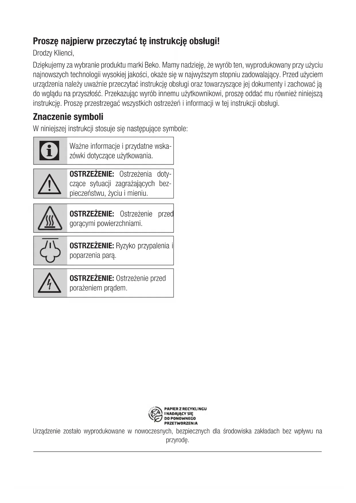 Warunkiem skorzystania z niniejszych Warunków Gwarancji jest: - użytkowanie Urządzenia zgodnie z Instrukcją Obsługi dołączoną do tego Urządzenia i jego przeznaczeniem, jak również odpowiednie czyszczenie i konserwacje Urządzenia; - użytkowanie w warunkach indywidualnego gospodarstwa domowego. Urządzenie nie jest używane do celów prowadzenia działalności gospodarczej lub w zastosowaniach eksploatacji masowej, w szczególności w gastronomicznej działalności hoteli, restauracji i innych obiektów turystyczno-rekreacyjnych lub zbiorowego żywienia. Stosowanie osprzętu zalecanego przez producenta; brak ingerencji w Urządzenie przez osoby do tego nieupoważnione; brak ingerencji w tabliczkę znamionową z numerem seryjnym Urządzenia. Udzielona przez Beko Gwarancja nie obejmuje: - wad powstałych z przyczyn innych niż tkwiące w Urządzeniu; - normalnego zużycia elementów eksploatacyjnych tj. akumulatory, baterie, noże, filtry, żarówki, szczotki, itp.; - czynności przewidzianych w Instrukcji Obsługi, do wykonania których zobowiązany jest Użytkownik Urządzenia we własnym zakresie i na swój koszt, w tym: instruktażu dotyczącego obsługi Urządzenia, instalacji oraz regulacji urządzenia. - usterek powstałych w wyniku nieprawidłowego lub niewłaściwego użytkowania, niedbalstwa, przypadkowego uszkodzenia Urządzenia, nieodpowiedniego napięcia prądu lub dokonania jakichkolwiek zmian, które mają wpływ na niewłaściwe działanie Urządzenia, i które naprawiane były przez osoby nieupoważnione, używania instalacji niezgodnych z odpowiednimi Polskimi Normami i innych niż wymienione w Instrukcji Obsługi Urządzenia; uszkodzeń mechanicznych, termicznych, chemicznych, korozji, innych uszkodzeń spowodowanych działaniem lub zaniedbaniem Użytkownika lub powstałych na skutek działania sił zewnętrznych (do których zalicza się w szczególności wyładowania atmosferyczne, skoki napięcia, wszystkiego rodzaju awarie domowej instalacji wodno- kanalizacyjnej, itp.), a także powstałych na skutek przedostania się zanieczyszczeń lub ciał obcych do Urządzenia, zakamienienia (proces odkamieniania musi być przeprowadzany zgodnie z instrukcją obsługi z użyciem odpowiednich środków czyszczących) elementów ze szkła, plastiku oraz porcelany; odbarwień Urządzenia lub poszczególnych jego części; - usterek powstałych na skutek przechowywania i użytkowania Urządzenia w warunkach, które są niezgodne z normalnymi warunkami domowymi określonymi wymaganiami powszechnie obowiązujących przepisów prawa i odpowiednich Polskich Norm;