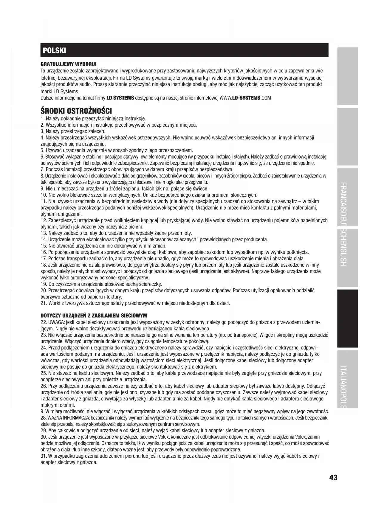 POLSKI GRATULUJEMY WYBORU! To urządzenie zostało zaprojektowane i wyprodukowane przy zastosowaniu najwyższych kryteriów jakościowych w celu zapewnienia wie- loletniej bezawaryjnej eksploatacji. Firma LD Systems gwarantuje to swoją marką i wieloletnim doświadczeniem w wytwarzaniu wysokiej jakości produktów audio. Proszę starannie przeczytać niniejszą instrukcję obsługi, aby móc jak najszybciej zacząć użytkować ten produkt marki LD Systems. Dalsze informacje na temat firmy LD SYSTEMS dostępne są na naszej stronie internetowej WWW.LD-SYSTEMS.COM