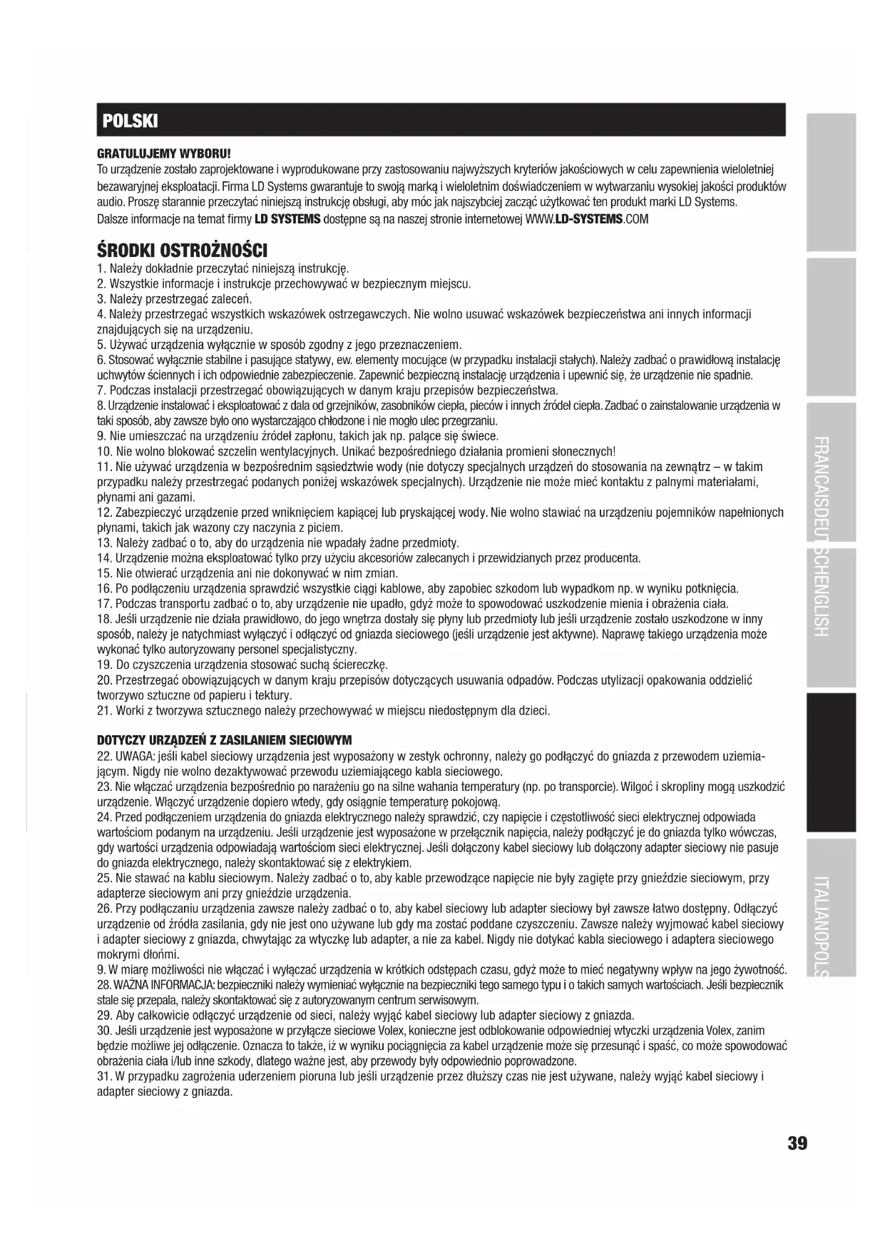 POLSKI GRATULUJEMY WYBORU! To urządzenie zostało zaprojektowane i wyprodukowane przy zastosowaniu najwyższych kryteriów jakościowych w celu zapewnienia wieloletniej bezawaryjnej eksploatacji. Firma LD Systems gwarantuje to swoją marką i wieloletnim doświadczeniem w wytwarzaniu wysokiej jakości produktów audio. Proszę starannie przeczytać niniejszą instrukcję obsługi, aby móc jak najszybciej zacząć użytkować ten produkt marki LD Systems. Dalsze informacje na temat firmy LD SYSTEMS dostępne są na naszej stronie internetowej WWW.LD-SYSTEMS.COM