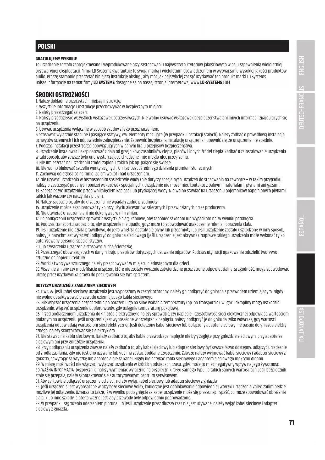 ITALIANO POLSKI ESPAÑOL FRANCAIS DEUTSCHENGLISHPOLSKI GRATULUJEMY WYBORU! To urządzenie zostało zaprojektowane i wyprodukowane przy zastosowaniu najwyższych kryteriów jakościowych w celu zapewnienia wieloletniej bezawaryjnej eksploatacji. Firma LD Systems gwarantuje to swoją marką i wieloletnim doświadczeniem w wytwarzaniu wysokiej jakości produktów audio. Proszę starannie przeczytać niniejszą instrukcję obsługi, aby móc jak najszybciej zacząć użytkować ten produkt marki LD Systems. Dalsze informacje na temat rmy LD SYSTEMS dostępne są na naszej stronie internetowej WWW.LD-SYSTEMS.COM