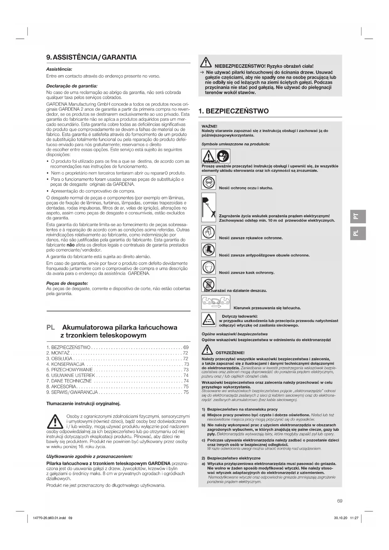 a) Naprawę elektronarzędzia należy zlecać wyłącznie wykwalifikowanym pracownikom i tylko z zastosowaniem oryginalnych części zamiennych. Dzięki temu można zapewnić utrzymanie bezpieczeństwa elektronarzędzia. b) Nigdy nie przeprowadzać konserwacji uszkodzonych akumulatorów. Konserwacja akumulatorów powinna zostać przeprowadzona wyłącznie przez producenta lub autoryzowane centrum serwisowe. Krajowe przepisy mogą ograniczać używanie pilarki łańcuchowej z trzonkiem teleskopowym. Przed użyciem produktu, a także po upadku lub mocniejszym uderzeniu produk- tu, należy sprawdzić produkt pod kątem istotnych uszkodzeń i usterek. Wskazówki bezpieczeństwa dotyczące pilarki łańcuchowej z trzonkiem teleskopowym a) Nie należy zbliżać części ciała do łańcucha. Nie należy próbować usu- wać ściętego materiału przy pracującym łańcuchu lub też przytrzymy- wać ciętych części. Po przełączeniu wyłącznika łańcuch nadal się porusza. Chwila nieuwagi podczas używania pilarki łańcuchowej z trzonkiem teleskopo- wym może doprowadzić do ciężkich obrażeń ciała. b) Podczas przenoszenia pilarkę łańcuchową z trzonkiem teleskopowym należy trzymać za uchwyt, łańcuch powinien być unieruchomiony, apalce powinny spoczywać z dala od wyłącznika. Prawidłowy sposób przenoszenia pilarki łańcuchowej z trzonkiem teleskopo- wym ogranicza ryzyko niezamierzonego uruchomienia narzędzia i wynikające- go z niego zranienia ciała przez łańcuch. c) Podczas transportu lub przechowywania pilarki łańcuchowej z trzon- kiem teleskopowym należy zawsze zakładać osłonę na łańcuch. Właściwe obchodzenie się z pilarką łańcuchową z trzonkiem teleskopowym zmniejsza ryzyko zranienia przez łańcuch. d) Przed przystąpieniem do usuwania zakleszczonego ściętego materia- łu lub do prac konserwacyjnych upewnić się, że wszystkie wyłączniki zostały przełączone, a blok akumulatora został wyjęty lub odłączony. Niezamierzone uruchomienie pilarki łańcuchowej z trzonkiem teleskopowym podczas usuwania zakleszczonego ściętego materiału lub podczas prac kon- serwacyjnych może doprowadzić do poważnych obrażeń ciała. e) Przed przystąpieniem do usuwania zakleszczonego ściętego mate- riału lub do prac konserwacyjnych upewnić się, że wszystkie wyłącz- niki zostały przełączone, a włącznik z blokadą do pracy ciągłej jest aktywny. Niezamierzone uruchomienie pilarki łańcuchowej z trzonkiem tele- skopowym podczas usuwania zakleszczonego ściętego materiału lub podczas prac konserwacyjnych może doprowadzić do poważnych obrażeń ciała. f) Pilarkę łańcuchową z trzonkiem teleskopowym należy trzymać wyłącznie za izolowane powierzchnie uchwytów, gdyż łańcuch może wejść w kontakt z ukrytymi przewodami. Kontakt łańcucha z przewodem przewodzącym prąd może przenieść napięcie na metalowe części urządzenia, co z kolei może prowadzić do porażenia prądem elektrycznym. g) Wszelkie przewody powinny znajdować się poza obszarem cięcia. Przewody mogą być ukryte w żywopłocie lub drzewach, w związku z tym może dojść do ich niezamierzonego uszkodzenia przez łańcuch. h) Nie używać pilarki łańcuchowej z trzonkiem teleskopowym podczas złej pogody, zwłaszcza podczas zagrożenia wyładowaniami atmosfe- rycznymi. Pozwoli to ograniczyć ryzyko uderzenia pioruna. Wskazówki bezpieczeństwa dotyczące pilarki łańcuchowej z trzonkiem teleskopowym: a) Aby uniknąć ryzyka śmiertelnego porażenia prądem, pilarki łańcucho- wej z trzonkiem teleskopowym o zwiększonym zasięgu nigdy nie uży- 14770-20.960.01.indd 70 30.10.20 11:27PL