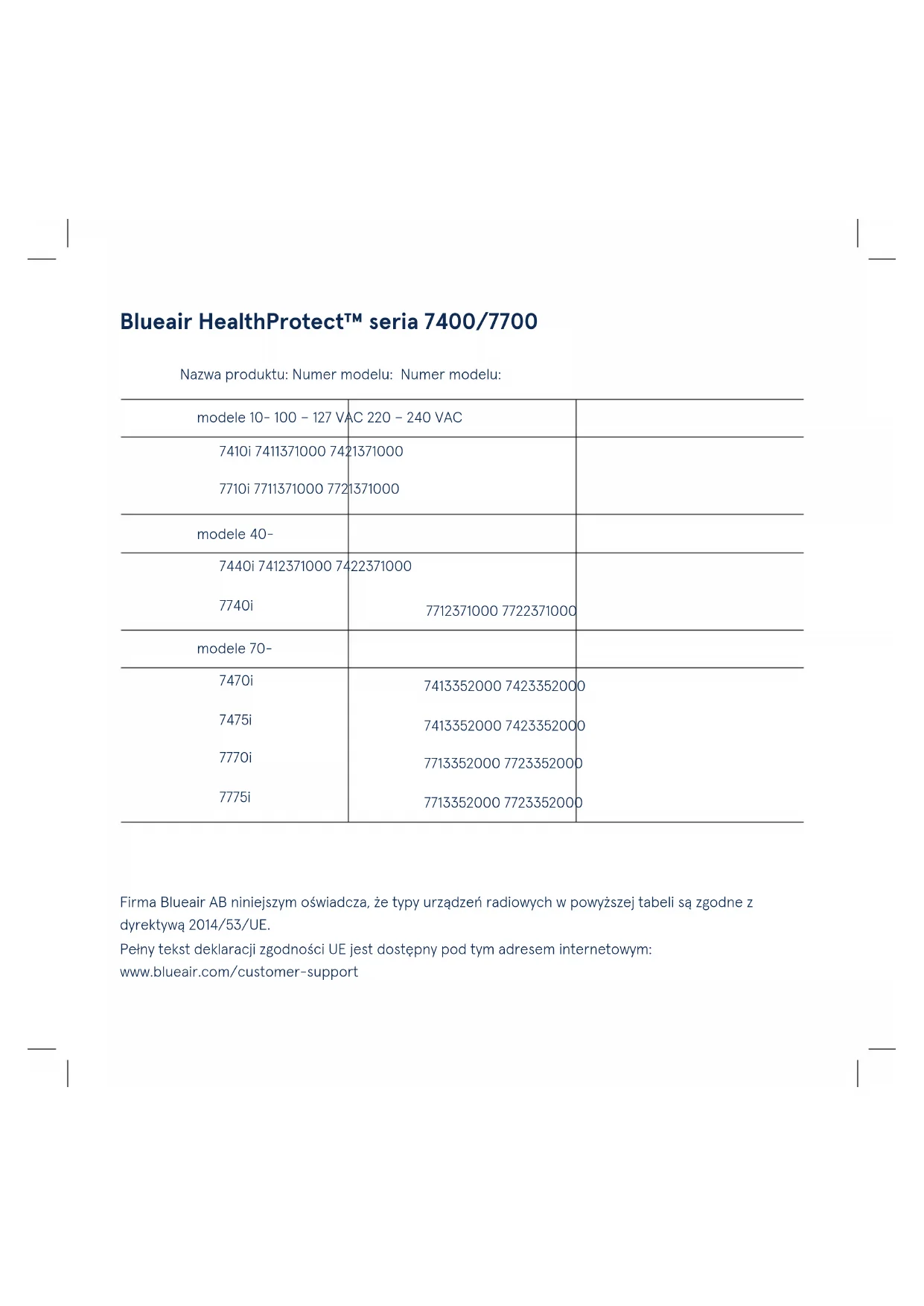 In overeenstemming met ANSI/AHAM AC-1-2019147Firma Blueair AB niniejszym oświadcza, że typy urządzeń radiowych w powyższej tabeli są zgodne z dyrektywą 2014/53/UE. Pełny tekst deklaracji zgodności UE jest dostępny pod tym adresem internetowym: www.blueair.com/customer-support Nazwa produktu: Numer modelu: Numer modelu: modele 10- 100 – 127 VAC 220 – 240 VAC 7410i 7411371000 7421371000 7710i 7711371000 7721371000 modele 40- 7440i 7412371000 7422371000 7740i