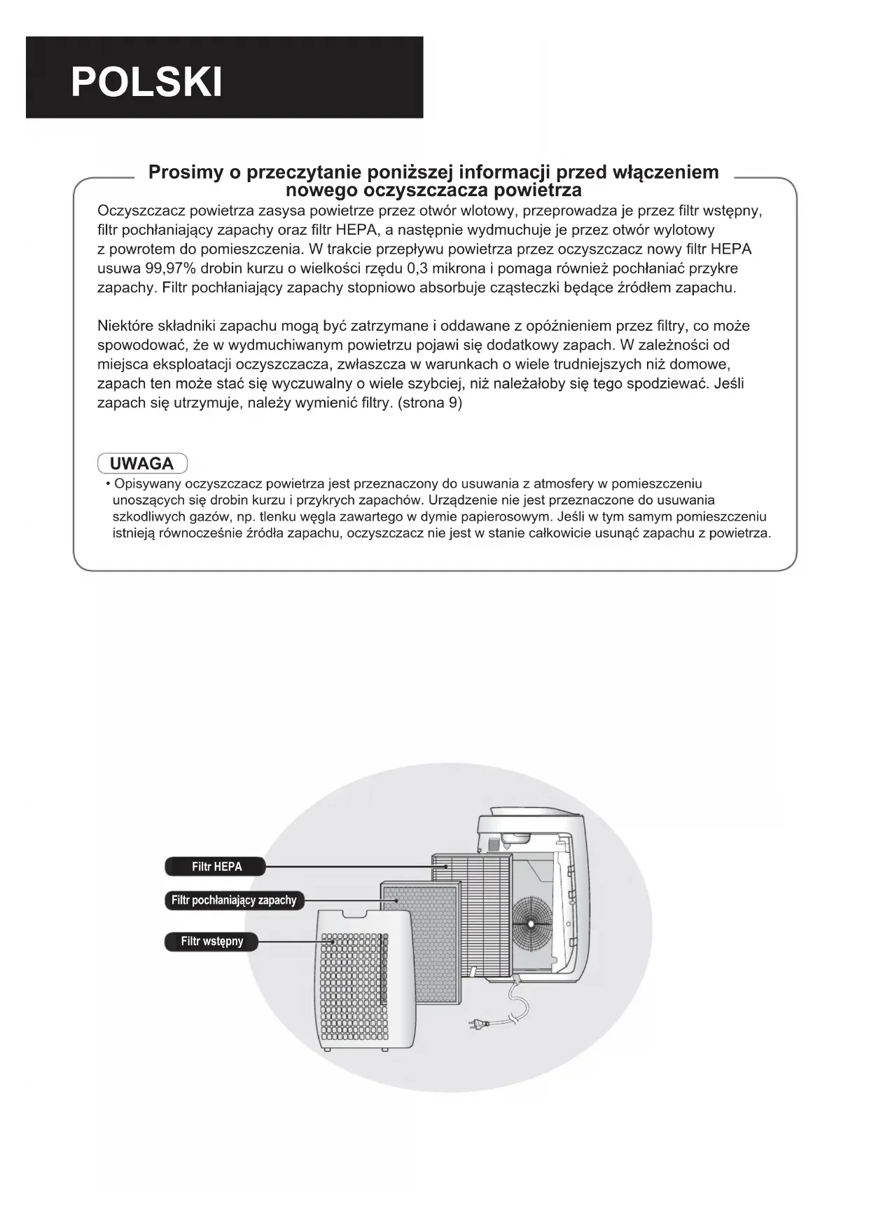 Operation manualPOLSKI Pre-FilterHEPA FilterDeodorizing Filter Oczyszczacz powietrza zasysa powietrze przez otwór wlotowy, przeprowadza je przez ltr wstępny, ltr pochłaniający zapachy oraz ltr HEPA, a następnie wydmuchuje je przez otwór wylotowy z powrotem do pomieszczenia. W trakcie przepływu powietrza przez oczyszczacz nowy ltr HEPA usuwa 99,97% drobin kurzu o wielkości rzędu 0,3 mikrona i pomaga również pochłaniać przykre zapachy. Filtr pochłaniający zapachy stopniowo absorbuje cząsteczki będące źródłem zapachu. Niektóre składniki zapachu mogą być zatrzymane i oddawane z opóźnieniem przez ltry, co może spowodować, że w wydmuchiwanym powietrzu pojawi się dodatkowy zapach. W zależności od miejsca eksploatacji oczyszczacza, zwłaszcza w warunkach o wiele trudniejszych niż domowe, zapach ten może stać się wyczuwalny o wiele szybciej, niż należałoby się tego spodziewać. Jeśli zapach się utrzymuje, należy wymienić ltry. (strona 9) UWAGA