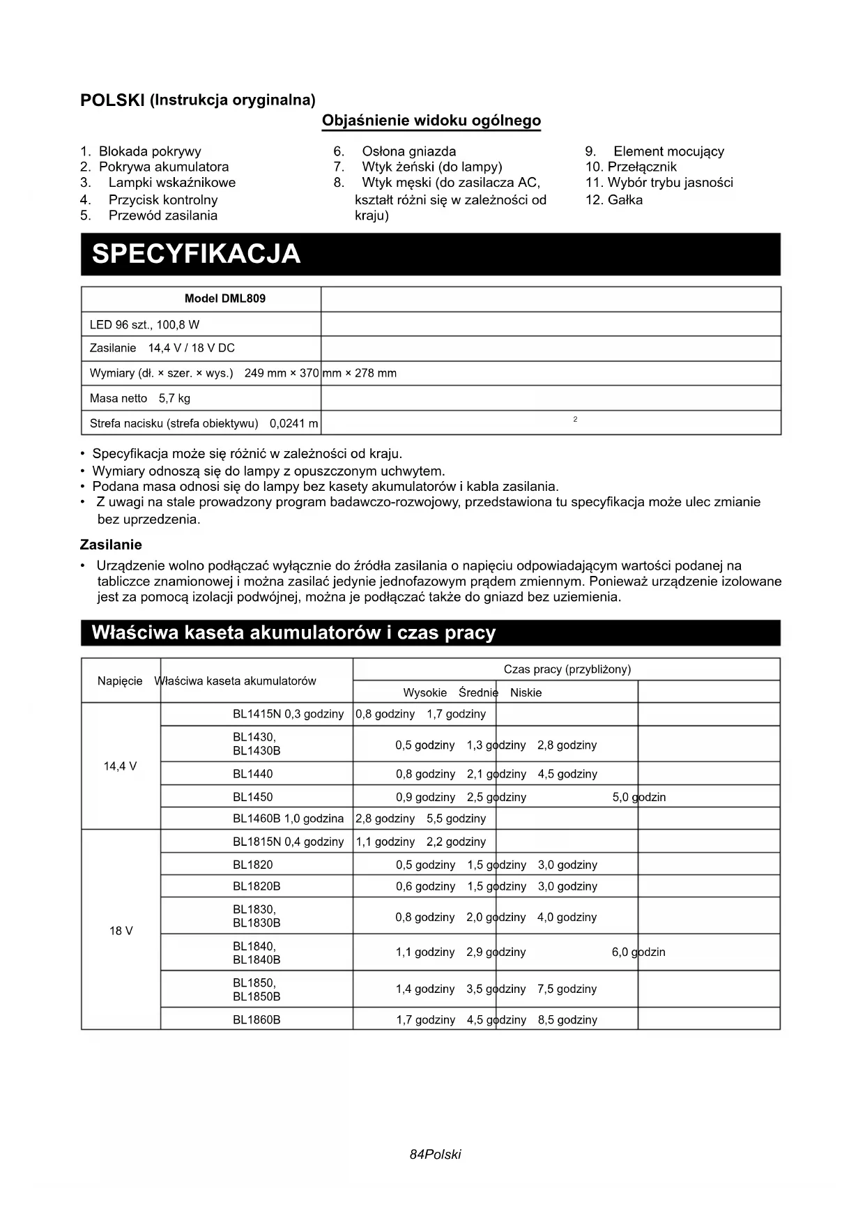 - Mõned loetletud esemed võivad olla seadme komplektis standardvarustusena. Need võivad riigiti erineda.84 Polski POLSKI (Instrukcja oryginalna) Objaśnienie widoku ogólnego 1. Blokada pokrywy2. Pokrywa akumulatora3. Lampkiwskaźnikowe4. Przyciskkontrolny5. Przewódzasilania6. Osłonagniazda7. Wtykżeński(dolampy)8. Wtykmęski(dozasilaczaAC,kształtróżnisięwzależnościodkraju)9. Elementmocujący10.Przełącznik11.Wybórtrybujasności12.Gałka SPECYFIKACJA Model DML809LED 96szt.,100,8WZasilanie 14,4V/18VDCWymiary(dł.×szer.×wys.) 249mm×370mm×278mmMasanetto 5,7kgStrefanacisku(strefaobiektywu) 0,0241m