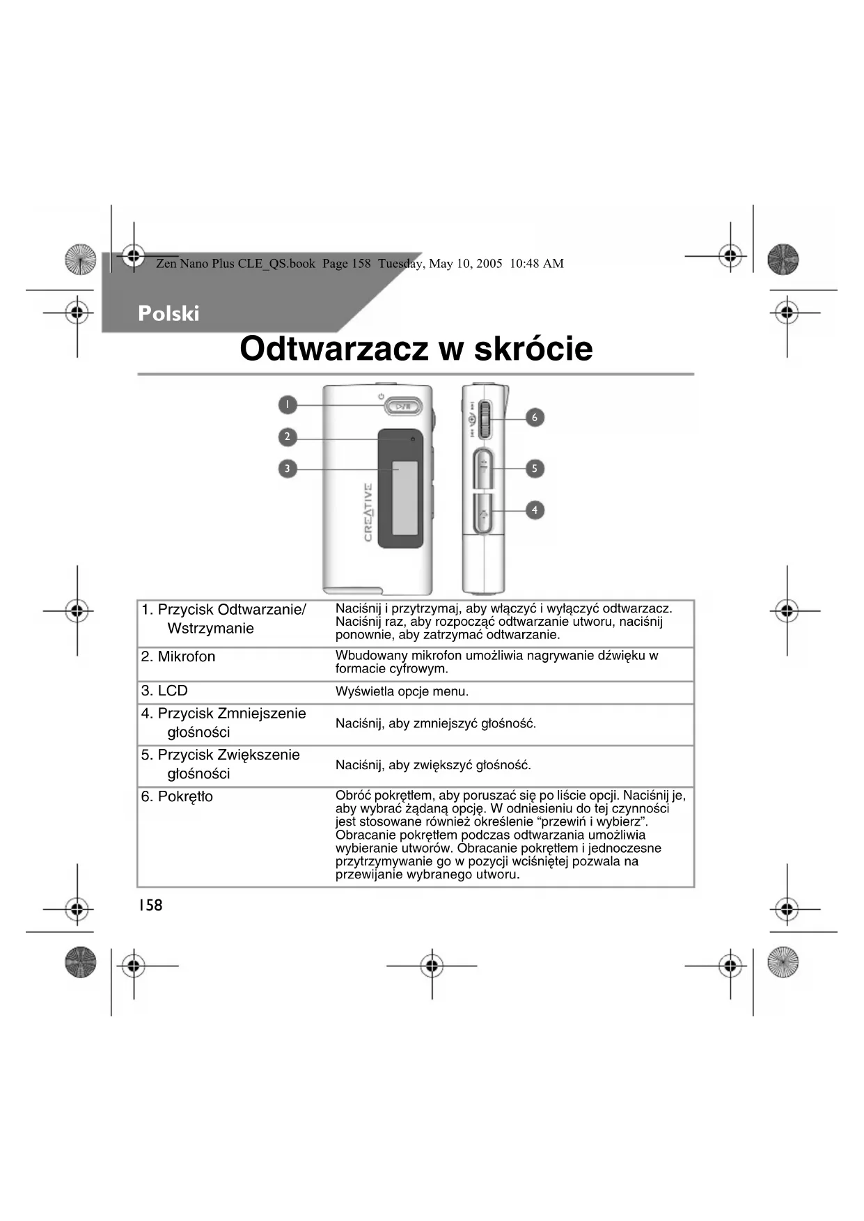 - Nie wolno dopuścić do tego, aby metalowe przedmioty miały kontakt ze stykami baterii. W przypadku wycieku, nieprzyjemnego zapachu, zmiany barwy lub odkształceń podczas ładowania lub użytkowania należy wyjąć baterię i zaprzestać jej używania. Przed kontaktem z żywnością lub wrażliwymi częściami ciała, na przykład oczami, należy dokładnie umyć ręce. Gwarancja nie obejmuje uszkodzeń wynikających z niewłaściwego użytkowania odtwarzacza. Więcej informacji zawiera umowa gwarancyjna dołączona do odtwarzacza. Zen Nano Plus CLE_QS.book Page 170 Tuesday, May 10, 2005 10:48 AM171 Краткие указания Краткое описание проигрывателя