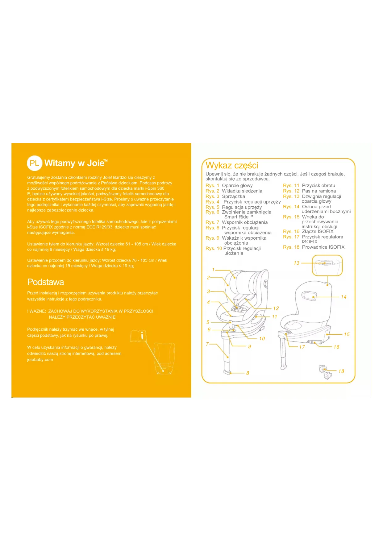 Gratulujemy zostania członkiem rodziny Joie! Bardzo się cieszymy z możliwości wspólnego podróżowania z Państwa dzieckiem. Podczas podróży z podwyższonym fotelikiem samochodowym dla dziecka marki i-Spin 360 E, będzie używany wysokiej jakości, podwyższony fotelik samochodowy dla dziecka z certyfikatem bezpieczeństwa i-Size. Prosimy o uważne przeczytanie tego podręcznika i wykonanie każdej czynności, aby zapewnić wygodną jazdę i najlepsze zabezpieczenie dziecka.Aby używać tego podwyższonego fotelika samochodowego Joie z połączeniami i-Size ISOFIX zgodnie z normą ECE R129/03, dziecko musi spełniać następujące wymagania.Ustawienie tyłem do kierunku jazdy: Wzrost dziecka 61 - 105 cm / Wiek dziecka co najmniej 6 miesięcy / Waga dziecka ≤ 19 kg;Ustawienie przodem do kierunku jazdy: Wzrost dziecka 76 - 105 cm / Wiek dziecka co najmniej 15 miesięcy / Waga dziecka ≤ 19 kg; Podstawa Przed instalacją i rozpoczęciem używania produktu należy przeczytać wszystkie instrukcje z tego podręcznika.! WAŻNE: ZACHOWAJ DO WYKORZYSTANIA W PRZYSZŁOŚCI.NALEŻY PRZECZYTAĆ UWAŻNIE.Podręcznik należy trzymać we wnęce, w tylnej części podstawy, jak na rysunku po prawej. W celu uzyskania informacji o gwarancji, należy odwiedzić naszą stronę internetową, pod adresem joiebaby.com Wykaz części Rys. 1 Oparcie głowyRys. 2 Wkładka siedzeniaRys. 3 Sprzączka Rys. 4 Przycisk regulacji uprzęży Rys. 5 Regulacja uprzężyRys. 6 Zwolnienie zamknięcia Smart Ride™Rys. 7 Wspornik obciążeniaRys. 8 Przycisk regulacji wspornika obciążeniaRys. 9 Wskaźnik wspornika obciążeniaRys. 10 Przycisk regulacji ułożeniaRys. 11 Przycisk obrotuRys. 12 Pas na ramionaRys. 13 Dźwignia regulacji oparcia głowyRys. 14 Osłona przed uderzeniami bocznymiRys. 15 Wnęka do przechowywania instrukcji obsługiRys. 16 Złącze ISOFIXRys. 17 Przycisk regulatora ISOFIXRys. 18 Prowadnice ISOFIXUpewnij się, że nie brakuje żadnych części. Jeśli czegoś brakuje, skontaktuj się ze sprzedawcą.