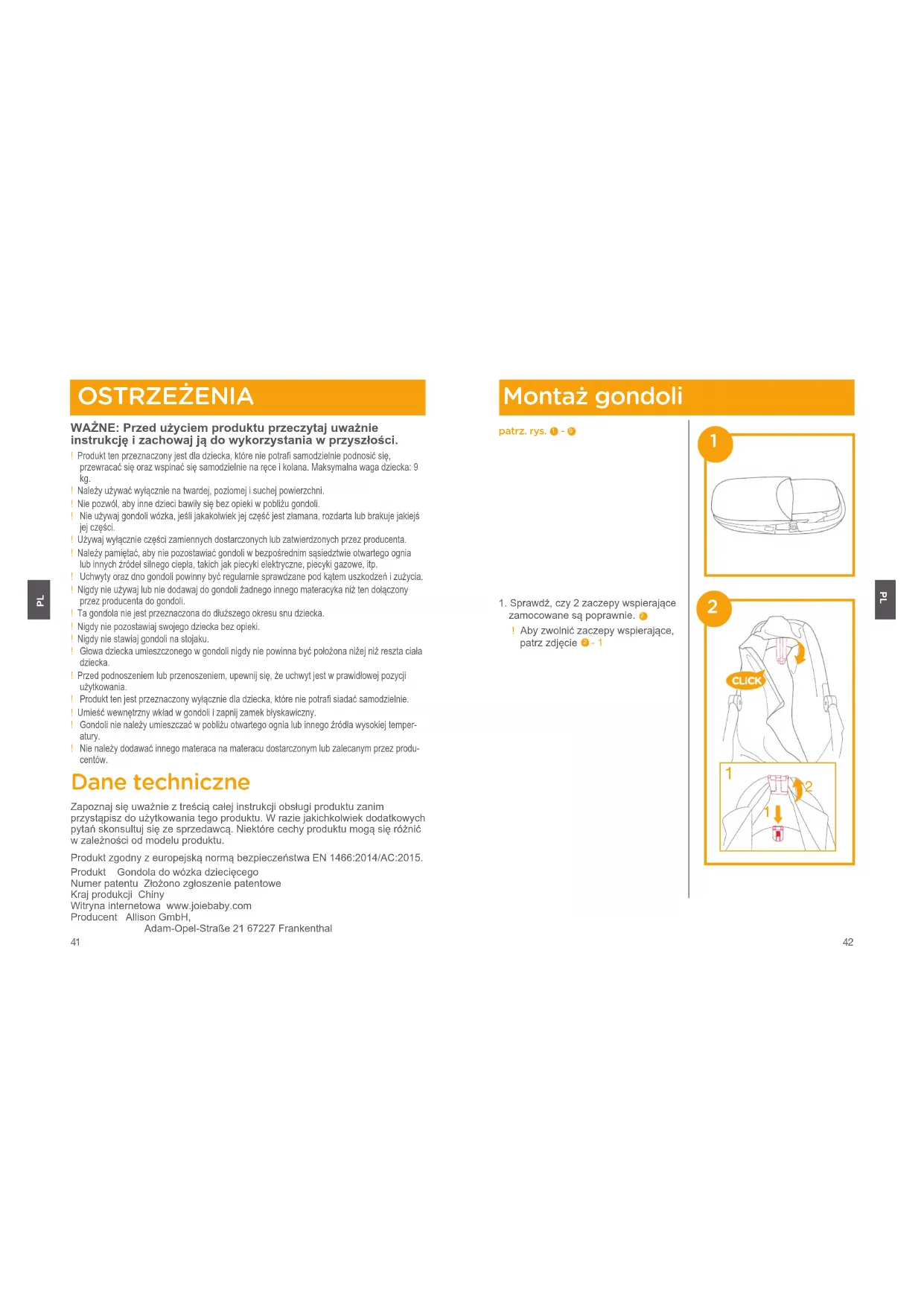 OSTRZEŻENIA WAŻNE: Przed użyciem produktu przeczytaj uważnie instrukcję i zachowaj ją do wykorzystania w przyszłości.! Produkt ten przeznaczony jest dla dziecka, które nie potrafi samodzielnie podnosić się, przewracać się oraz wspinać się samodzielnie na ręce i kolana. Maksymalna waga dziecka: 9 kg. ! Należy używać wyłącznie na twardej, poziomej i suchej powierzchni.! Nie pozwól, aby inne dzieci bawiły się bez opieki w pobliżu gondoli. ! Nie używaj gondoli wózka, jeśli jakakolwiek jej część jest złamana, rozdarta lub brakuje jakiejś jej części.! Używaj wyłącznie części zamiennych dostarczonych lub zatwierdzonych przez producenta.! Należy pamiętać, aby nie pozostawiać gondoli w bezpośrednim sąsiedztwie otwartego ognia lub innych źródeł silnego ciepła, takich jak piecyki elektryczne, piecyki gazowe, itp. ! Uchwyty oraz dno gondoli powinny być regularnie sprawdzane pod kątem uszkodzeń i zużycia. ! Nigdy nie używaj lub nie dodawaj do gondoli żadnego innego materacyka niż ten dołączony przez producenta do gondoli.! Ta gondola nie jest przeznaczona do dłuższego okresu snu dziecka.! Nigdy nie pozostawiaj swojego dziecka bez opieki.! Nigdy nie stawiaj gondoli na stojaku. ! Głowa dziecka umieszczonego w gondoli nigdy nie powinna być położona niżej niż reszta ciała dziecka.! Przed podnoszeniem lub przenoszeniem, upewnij się, że uchwyt jest w prawidłowej pozycji użytkowania. ! Produkt ten jest przeznaczony wyłącznie dla dziecka, które nie potrafi siadać samodzielnie. ! Umieść wewnętrzny wkład w gondoli i zapnij zamek błyskawiczny. ! Gondoli nie należy umieszczać w pobliżu otwartego ognia lub innego źródła wysokiej temper- atury. ! Nie należy dodawać innego materaca na materacu dostarczonym lub zalecanym przez produ- centów. Dane techniczne Zapoznaj się uważnie z treścią całej instrukcji obsługi produktu zanim przystąpisz do użytkowania tego produktu. W razie jakichkolwiek dodatkowych pytań skonsultuj się ze sprzedawcą. Niektóre cechy produktu mogą się różnić w zależności od modelu produktu.Produkt zgodny z europejską normą bezpieczeństwa EN 1466:2014/AC:2015. Produkt Gondola do wózka dziecięcegoNumer patentu Złożono zgłoszenie patentoweKraj produkcji ChinyWitryna internetowa www.joiebaby.comProducent Allison GmbH, Adam-Opel-Straße 21 67227 Frankenthal Montaż gondoli patrz. rys.