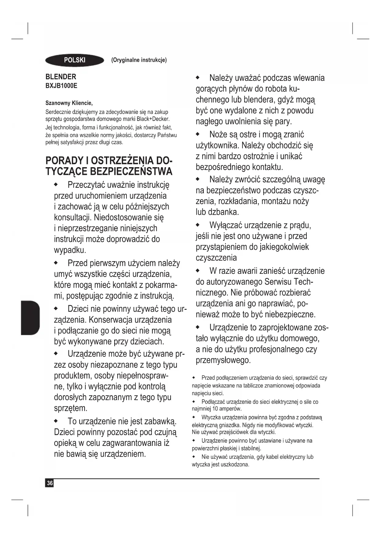 BLENDER BXJB1000E Szanowny Kliencie, Serdecznie dziękujemy za zdecydowanie się na zakup sprzętu gospodarstwa domowego marki Black+Decker. Jej technologia, forma i funkcjonalność, jak również fakt, że spełnia ona wszelkie normy jakości, dostarczy Państwu pełnej satysfakcji przez długi czas.