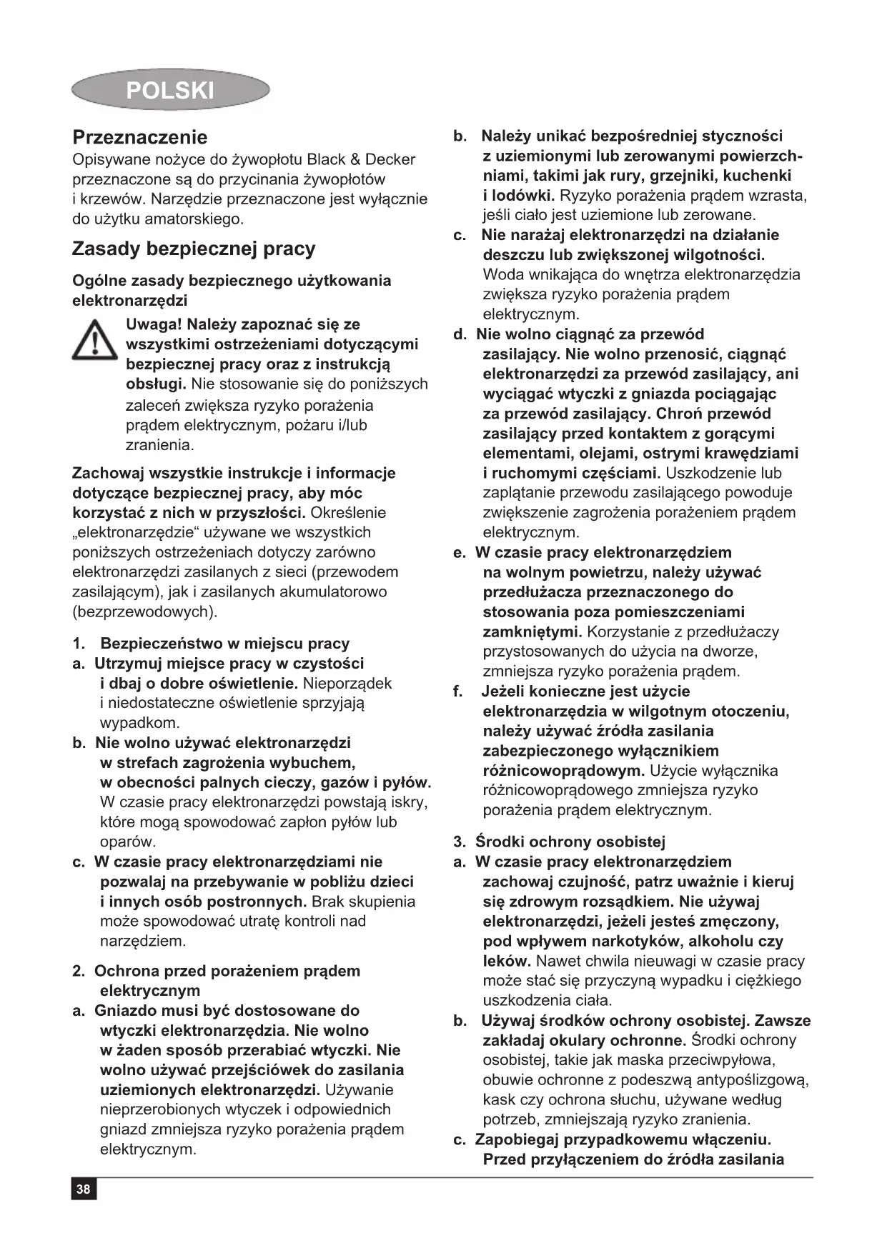 a. Powierzaj naprawy elektronarzędzi wyłącznie osobom wykwalifi kowanym, używającym identycznych części zamiennych. Zapewni to bezpieczeństwo użytkowania naprawionego urządzenia. Bezpieczne użytkowanie elektronarzędzi - wskazówki dodatkowe Uwaga! Dodatkowe wskazówki bezpieczeństwa dla użytkowników nożyc do żywopłotu. ♦ Unikaj wszelkiego kontaktu z brzeszczotem nożyc. Nie wolno usuwać odciętych części ani przytrzymywać gałęzi, gdy brzeszczot porusza się. Przed przystąpieniem do wyciągania zaklinowanych elementów upewnij się, że wyłącznik znajduje się w pozycji „wyłączone“. Nawet chwila nieuwagi w czasie pracy narzędziem może być przyczyną poważnego zranienia. ♦ Nożyce należy przenosić trzymając za uchwyt, gdy brzeszczot całkowicie zatrzyma się. Na czas transportu i przechowywania należy zawsze zakładać osłonę na brzeszczot. Odpowiednie obchodzenie się z nożycami zmniejsza ryzyko zranienia brzeszczotem. ♦ Przewód musi znajdować się z dala od miejsca cięcia. W czasie pracy przewód może40 POLSKI zostać zakryty gałęziami i zostać przypadkowo przecięty. ♦ Opisywane narzędzie nie jest przeznaczone do użycia przez dzieci i osoby o ograniczonych możliwościach fi zycznych, umysłowych i pojmowania zmysłowego lub bez doświadczenia i dostatecznej wiedzy, chyba, że pozostają one pod opieką lub zostały przeszkolone, przez osoby odpowiedzialne za ich bezpieczeństwo. Nie wolno dopuszczać, aby dzieci bawiły się urządzeniem. ♦ Przeznaczenie urządzenia opisane jest w tej instrukcji obsługi. Użycie wszelkich akceso- riów, przystawek lub wykonywanie prac innych niż opisane w instrukcji obsługi, może stwarzać ryzyko zranienia i/lub uszkodzenia mienia. ♦ Nie wolno przenosić narzędzia trzymając za przedni uchwyt, wyłącznik lub wyłącznik spustowy, dopóki akumulator nie został wyjęty. ♦ Użytkownicy, który pierwszy raz korzystają z nożyc do żywopł otów powinni oprócz przeczytania instrukcji obsługi skorzystać z porady bardziej doświadczonych użytkowników. ♦ Nigdy nie wolno dotykać brzeszczotu w czasie pracy narzędzia. ♦ Nie wolno na siłę zatrzymywać brzeszczotu. ♦ Nigdy nie odkładaj narzędzia, dopóki noże całkowicie nie zatrzymają się. ♦ Regularnie sprawdzaj czy brzeszczot nie jest uszkodzony lub zużyty. Nie wolno używać narzędzia, jeśli brzeszczot jest uszkodzony. ♦ W czasie cięcia uważaj na twarde przedmioty (np. przewody metalowe, druty). Jeśli przez przypadek dojdzie do kontaktu z takim przedmiotem, należy natychmiast wyłączyć urządzenie i sprawdzić czy nie zostało uszkodzone. ♦ Jeśli urządzenie zacznie drgać w nietypowy sposób, należy natychmiast wyłączyć urządzenie i sprawdzić czy nie zostało uszkodzone. ♦ Jeśli urządzenie się zablokuje, należy je natychmiast wyłączyć. Przed przystąpieniem do odblokowywania należy wyjąć akumulator. ♦ Po użyciu należy nałożyć osłonę na brzeszczot. Narzędzie należy przechowywać tak, aby brzeszczot był osłonięty. ♦ Należy zawsze upewnić się, że wszystkie osłony są zamontowane. Nie wolno używać niekompletnych narzędzi ani narzędzi poddanych modyfi kacjom. ♦ Nie wolno pozwalać dzieciom na zabawę narzędziem. ♦ W czasie cięcia gałęzi znajdujących się wysoko, należy uwa żać na spadające ścinki. ♦ Trzymaj narzędzie obiema rękami za przewidziane do tego uchwyty. Bezpieczeństwo osób postronnych ♦ Opisywane narzędzie nie może być używane przez osoby (dot. także dzieci), które mają ograniczone możliwości ruchowe, percepcji lub pojmowania lub brakuje im doświadczenia i wiedzy, z wyjątkiem przypadku, gdy pozostają one pod nadzorem osoby odpowiedzialnej za ich bezpieczeństwo lub zostały przez nią przeszkolone w zakresie obsługi urządzenia. ♦ Należy pilnować dzieci, aby nie bawiły się urządzeniem. Drgania Podawana w tabeli danych technicznych oraz w deklaracji zgodności z normami wartość drgań (wibracji), została zmierzona zgodnie ze standardową procedurą zawartą w normie EN 60745. Informacja ta może służyć do porównywania tego narzędzia z innymi. Deklarowana wartość emitowanych drgań może również służyć do przewidywania stopnia narażenia użytkownika na wibracje. Uwaga! Chwilowa siła drgań, występująca w czasie pracy elektronarzędziem, może odbiegać od podawanych wartości, w zależności od sposobu użytkowania urządzenia. Poziom wibracji może przekroczyć podawaną wartość. Przy określaniu ekspozycji na wibracje, w celu podjęcia środków ochrony osób zawodowo użytkujących elektronarzędzia, zgodnie z normą 2002/44/EC, należy uwzględnić rzeczywiste warunki i rodzaj wykonywanej pracy. Także okresy przestoju i pracy bez obciążenia. Symbole na urządzeniu Na obudowie narzędzia umieszczono następujące piktogramy: Uwaga! Aby zminimalizować ryzyko zranienia, użytkownik musi zapoznać się z instrukcją obsługi. Należy zakładać okulary ochronne oraz stosować ochronę słuchu. Stosuj rękawice w czasie pracy.41 POLSKI Jeśli przewód został uszkodzony lub przecięty, natychmiast odłącz go od zasilania. Nie wolno wystawiać narzędzia na działanie deszczu lub dużej wilgotności. Ochrona przed porażeniem prądem elektrycznym Opisywane elektronarzędzie jest podwójnie izolowane; dlatego nie ma konieczności dodatkowego uziemienia. Zawsze sprawdzaj, czy napięcie sieci zasilającej jest zgodne z wartością podaną na tabliczce znamionowej. ♦ Jeśli przewód zasilający jest uszkodzony, należy ze względów bezpieczeństwa jego wymianę powierzyć producentowi lub autoryzowanemu przedstawicielowi serwisowemu Black & Decker. Użycie przedłużaczy Używaj wyłącznie przedłużaczy posiadających atest i przystosowanych do zasilania danego narzędzia (patrz dane techniczne). Przedłużacz musi być prze- znaczony do użycia na dworze i posiadać odpowied- nie oznaczenia