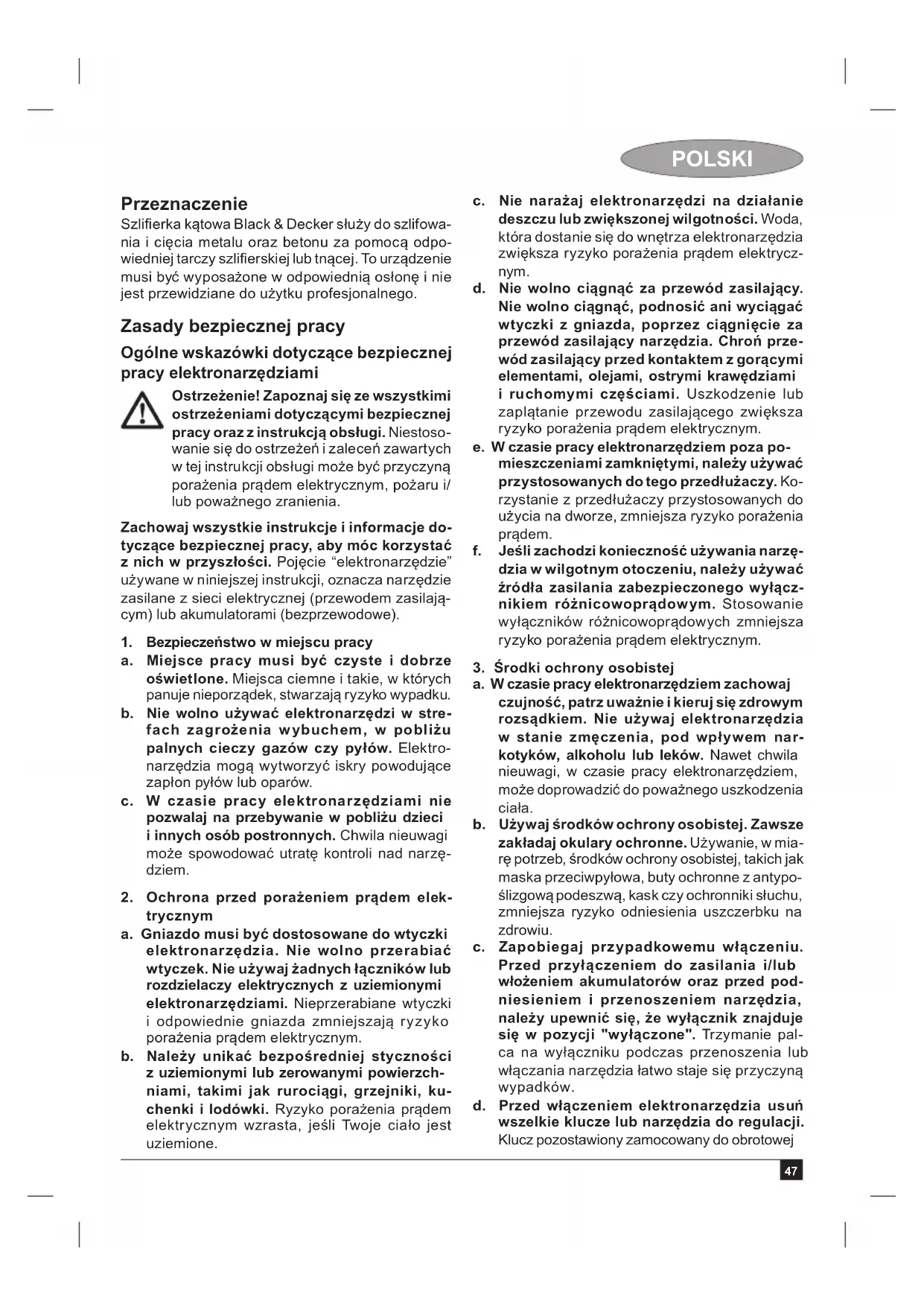a) wadliwe działanie lub uszkodzenia spowodowane niewłaściwym użytkowaniem lub używaniem produktu niezgodnie z przeznaczeniem, instrukcją obsługi lub przepisami bezpieczeństwa. W szczególności profesjonalne użytkowanie amatorskich narzędzi Black & Decker powoduje utratę gwarancji; b) wadliwe działanie lub uszkodzenia spowodowane przeciążaniem narzędzia, które prowadzi do uszkodzeń silnika, przekładni lub innych elementów a także stosowaniem osprzętu innego niż zalecany przez Black & Decker; c) mechaniczne uszkodzenia produktu i wywołane nimi wady;