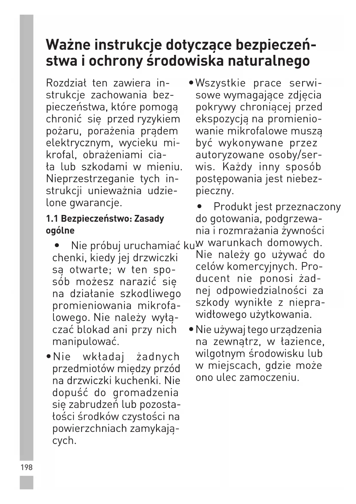 (door een belemmering aan de voorkant van de deur, lage spanning enz.) Trek de stekker uit het stopcontact. Steek de stekker na 10 seconden terug in het stopcontact.198 Rozdział ten zawiera in- strukcje zachowania bez- pieczeństwa, które pomogą chronić się przed ryzykiem pożaru, porażenia prądem elektrycznym, wycieku mi- krofal, obrażeniami cia- ła lub szkodami w mieniu. Nieprzestrzeganie tych in- strukcji unieważnia udzie- lone gwarancje.