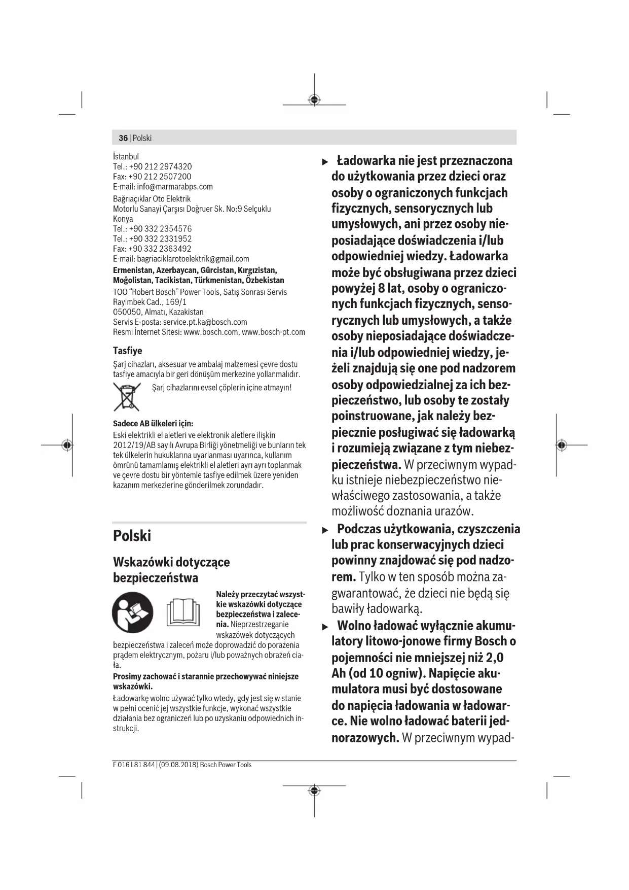 Napięcie ładowania akumula- torów (automatyczne rozpo- znawanie napięcia) V 36 Prąd ładowania A 2,0 Dopuszczalny zakres tempe- ratur ładowania °C 0 – 45 Czas ładowania przy pojem- ności akumulatora, ok. – 2,0 Ah min 65 – 4,0 Ah min 125 – 6,0 Ah min 185 Liczba ogniw akumulatora 10 – 30 Ciężar odpowiednio do EPTA‑Procedure 01:2014 kg 0,55 Klasa ochrony / II Praca Uruchamianie u Należy zwrócić uwagę na napięcie sieciowe! Napięcie źródła zasilania musi zgadzać się z danymi na tabliczce znamionowej ładowarki. Ładowarki przeznaczone do pra- cy pod napięciem 230V można podłączyć również do sie- ci 220V. Proces ładowania Ładowanie rozpoczyna się w momencie włożenia wtyczki ła- dowarki do gniazda sieciowego i umieszczenia akumulatora (1) we wnęce ładowania (2). Inteligentny proces ładowania pozwala na automatyczne roz- poznawanie stanu naładowania akumulatora i optymalny do- bór prądu ładowania, w zależności od napięcia i temperatury akumulatora. Ma to wpływ na wydłużenie żywotności akumulatora, a poza tym akumulator, przechowywany w ładowarce, będzie stale naładowany do pełna. Znaczenie wskaźników Miganie zielonego wskaźnika naładowania akumulatora (4) Proces szybkiego ładowania sygnalizowany jest miganiem zielonego wskaźnika ładowa- nia akumulatora (4). Akumulator można w do- wolnej chwili wyjąć z ładowarki i użyć. Wskazówka: Ładowanie jest możliwe tylko wtedy, gdy tem- peratura akumulatora znajduje się w dopuszczalnym zakre- sie temperatur, zob. rozdział „Dane techniczne”. Polski | 37 Bosch Power Tools F 016 L81 844 | (09.08.2018)38 | Polski F 016 L81 844 | (09.08.2018) Bosch Power Tools Światło ciągłe zielonego wskaźnika naładowania akumulatora (4) Światło ciągłe zielonego wskaźnika naładowa- nia akumulatora (4) sygnalizuje, że akumulator został całkowicie naładowany. Po zakończeniu ładowania akumulator można wyjąć i zacząć go używać. Jeżeli w ładowarce nie ma akumulatora, światło ciągłe zielo- nego wskaźnika naładowania akumulatora (4) sygnalizuje, że wtyczka jest włożona do gniazda zasilania, a ładowarka jest gotowa do użycia. Światło ciągłe czerwonego wskaźnika naładowania akumulatora (3) Światło ciągłe czerwonego wskaźnika nałado- wania akumulatora (3) sygnalizuje, że tempe- ratura akumulatora znajduje się poza dopusz- czalnym zakresem temperatur, zob. rozdział „Dane techniczne”. Proces ładowania rozpocznie się po osią- gnięciu dopuszczalnego zakresu temperatur. Miganie czerwonego wskaźnika naładowania akumulatora (3) Miganie czerwonego wskaźnika naładowania akumulatora (3) sygnalizuje inne zakłócenia procesu ładowania, zob. rozdział „Błędy – przyczyny i usuwanie”. Błędy – przyczyny i usuwanie Przyczyna Rozwiązanie Czerwony wskaźnik naładowania akumulatora (3) miga Nie można naładować akumulatora Akumulator nie został (prawi- dłowo) włożony Umieścić akumulator prawi- dłowo na ładowarce Styki akumulatora są zabru- dzone Oczyścić styki akumulatora; np. poprzez kilkakrotne wło- żenie i wyjęcie akumulatora lub wymienić akumulator na nowy Akumulator jest uszkodzony Wymienić akumulator na no-