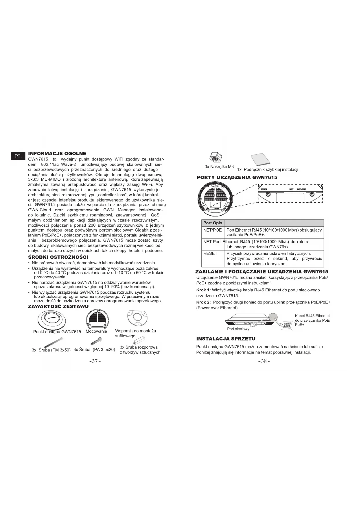 ZASILANIE I PODŁĄCZANIE URZĄDZENIA GWN7615 Urządzenie GWN7615 można zasilać, korzystając z przełącznika PoE/ PoE+ zgodne z poniższymi instrukcjami. Krok 1: Włożyć wtyczkę kabla RJ45 Ethernet do portu sieciowego urządzenia GWN7615. Krok 2: Podłączyć drugi koniec do portu uplink przełącznika PoE/PoE+ (Power over Ethernet). Port Opis NET/POE Port Ethernet RJ45 (10/100/1000 Mb/s) obsługujący zasilanie PoE/PoE+. NET Port Ethernet RJ45 (10/100/1000 Mb/s) do rutera lub innego urządzenia GWN76xx. RESET Przycisk przywracania ustawień fabrycznych. Przytrzymać przez 7 sekund, aby przywrócić domyślne ustawienia fabryczne. 1x Podręcznik szybkiej instalacji 3x Nakrętka M3 3x Śruba (PM 3x50) 3x Śruba (PA 3.5x20) 3x Śruba rozporowa z tworzyw sztucznych Punkt dostępu GWN7615 Port sieciowy Kabel RJ45 Ethernet do przełącznika PoE/ PoE+
