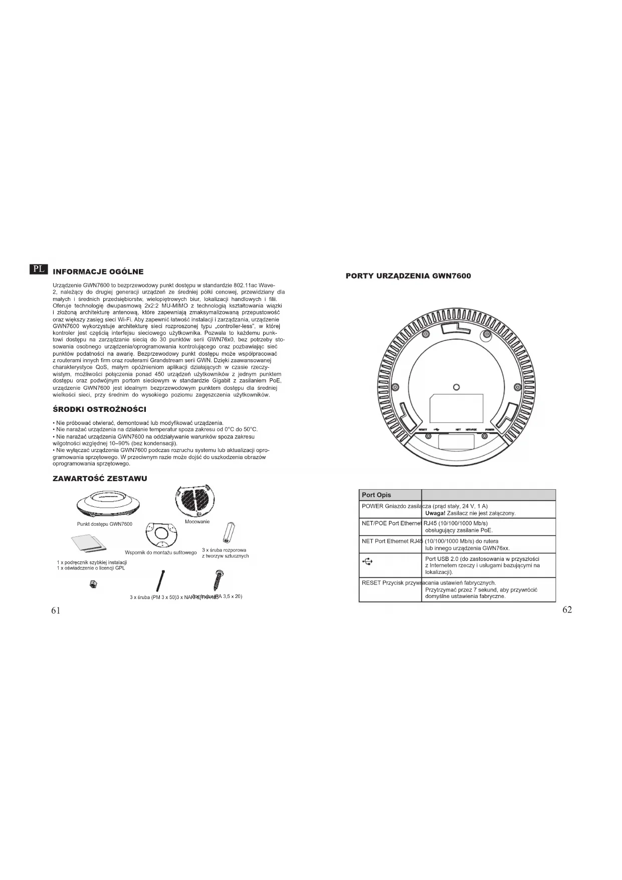 Port Opis POWER Gniazdo zasilacza (prąd stały, 24 V, 1 A) Uwaga! Zasilacz nie jest załączony. NET/POE Port Ethernet RJ45 (10/100/1000 Mb/s) obsługujący zasilanie PoE. NET Port Ethernet RJ45 (10/100/1000 Mb/s) do rutera lub innego urządzenia GWN76xx. Port USB 2.0 (do zastosowania w przyszłości z Internetem rzeczy i usługami bazującymi na lokalizacji). RESET Przycisk przywracania ustawień fabrycznych. Przytrzymać przez 7 sekund, aby przywrócić domyślne ustawienia fabryczne.