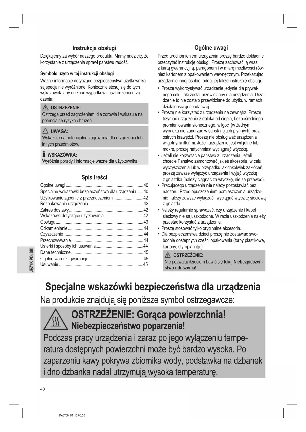 - Dla bezpieczeństwa dzieci proszę nie zostawiać swo- bodnie dostępnych części opakowania (torby plastikowe, kartony, styropian itp.). OSTRZEŻENIE: Nie pozwalaj dzieciom bawić się folią. Niebezpieczeń- stwo uduszenia! Specjalne wskazówki bezpieczeństwa dla urządzenia Na produkcie znajdują się poniższe symbol ostrzegawcze: OSTRZEŻENIE: Gorąca powierzchnia! Niebezpieczeństwo poparzenia! Podczas pracy urządzenia i zaraz po jego wyłączeniu tempe- ratura dostępnych powierzchni może być bardzo wysoka. Po zaparzeniu kawy pokrywa zbiornika wody, podstawka na dzbanek i dno dzbanka nadal utrzymują wysoka temperaturę.KA3756_IM 15.06.20
