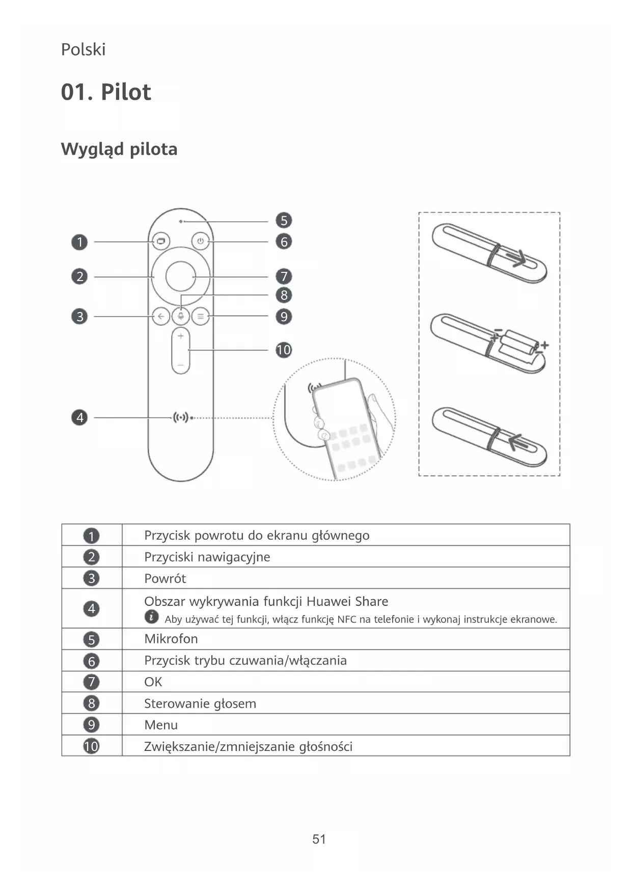 Przycisk powrotu do ekranu głównego Przyciski nawigacyjne Powrót Obszar wykrywania funkcji Huawei Share Aby używać tej funkcji, włącz funkcję NFC na telefonie i wykonaj instrukcje ekranowe. Mikrofon Przycisk trybu czuwania/włączania