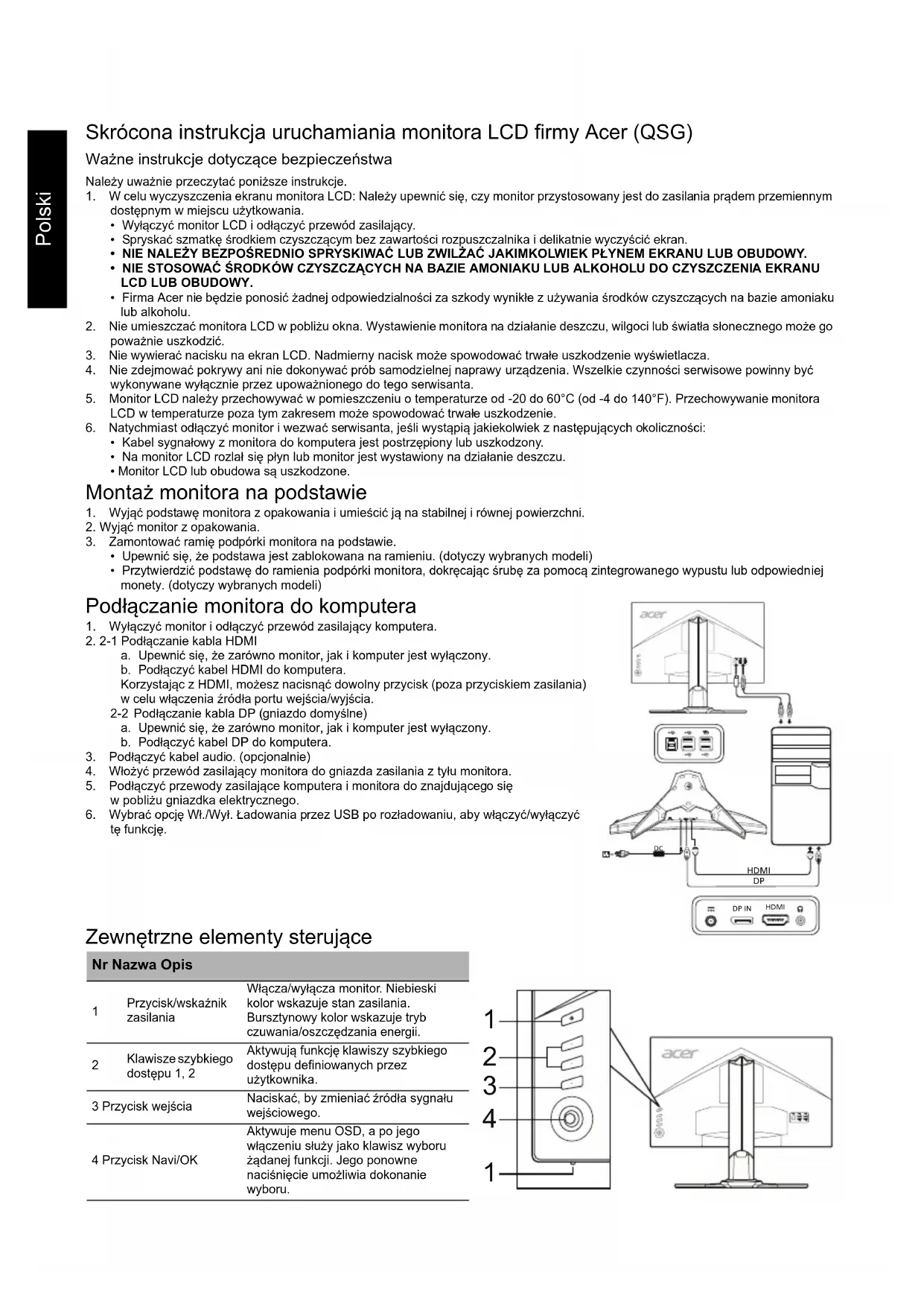 nVidia 3D Light Boost Transparantie Breedbeeldmodus Ingang Sneltoetstoewijzing Snelstartmodus Modi Overklokken (alleen DP) Scherminformatie Opn.instellen Afsluiten Alle specificaties kunnen zonder voorafgaande kennisgeving worden gewijzigd.Polski Skrócona instrukcja uruchamiania monitora LCD firmy Acer (QSG) Ważne instrukcje dotyczące bezpieczeństwa Należy uważnie przeczytać poniższe instrukcje. 1. W celu wyczyszczenia ekranu monitora LCD: Należy upewnić się, czy monitor przystosowany jest do zasilania prądem przemiennym dostępnym w miejscu użytkowania.