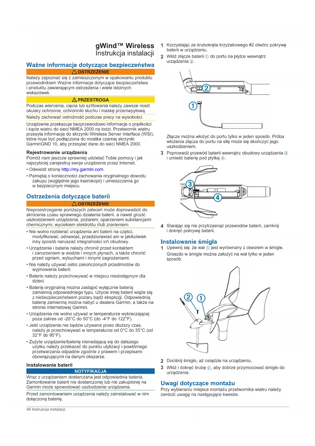 Sätt tillbaka batterilocket på vindgivaren. Specifikationer Specifikation Värde Mått när den är monterad (H × L) 345 mm (13,58 tum) × 610 mm (24 tum) Vikt 350 g (12,35 ounce) Drifttemperatur Från -20 till 50 °C (-4 till 122 °F) Förvaringstemperatur Från 0 till 35 °C (32 till 95 °F) Vattentålighetsklassning (vindgivare) IEC 60529 IPX-6 (skyddad mot kraftig sjö) Vattentålighetsklassning (WSI) IEC 60529 IPX-0 (inga särskilt skydd) Strömförbrukning (WSI och GND 10) 1,1 W Normal strömförbrukning vid 12 V DC (WSI och GND 10) 95 mA Vindstyrkeintervall Från 0,9 till 50 m/s (från 0,9 till 90 knop) Installationsinstruktioner 45gWind™ Wireless Instrukcja instalacji Ważne informacje dotyczące bezpieczeństwa OSTRZEŻENIE Należy zapoznać się z zamieszczonym w opakowaniu produktu przewodnikiem Ważne informacje dotyczące bezpieczeństwa i produktu zawierającym ostrzeżenia i wiele istotnych wskazówek. PRZESTROGA Podczas wiercenia, cięcia lub szlifowania należy zawsze nosić okulary ochronne, ochronniki słuchu i maskę przeciwpyłową. Należy zachować ostrożność podczas pracy na wysokości. Urządzenie przekazuje bezprzewodowo informacje o prędkości i kącie wiatru do sieci NMEA 2000 na łodzi. Przetwornik wiatru przesyła informacje do skrzynki Wireless Server Interface (WSI), która musi być podłączona do mostka czarnej skrzynki GarminGND 10, aby przesyłać dane do sieci NMEA 2000. Rejestrowanie urządzenia Pomóż nam jeszcze sprawniej udzielać Tobie pomocy i jak najszybciej zarejestruj swoje urządzenie przez Internet.