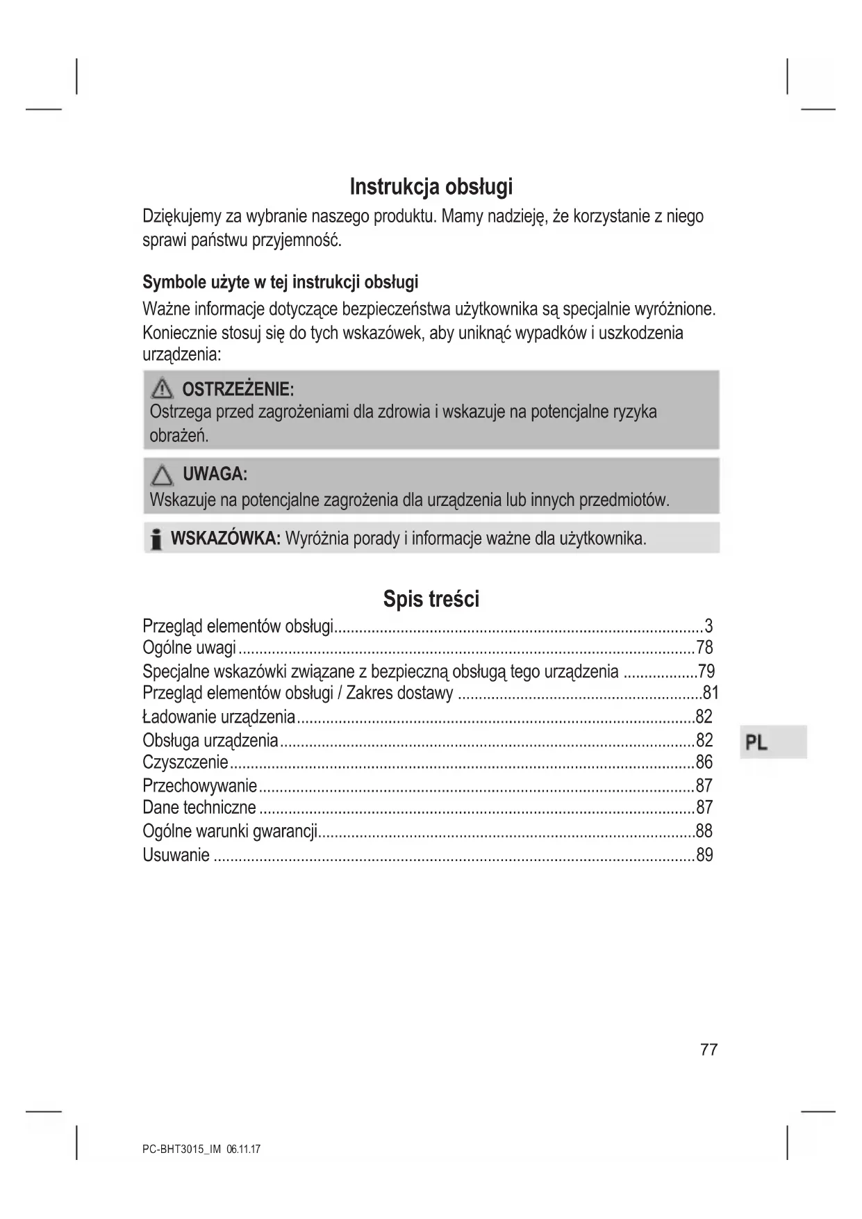 Usuwanie Wyjmowanie / Usuwanie baterii wielokrotnego ładowania Urządzenie posiada akumulator. Zużytych baterii / akumulatorów nie na- leży wyrzucać do zwykłych odpadów domowych. Akumulator należy wyjąć, zanim produkt zostanie poddany recyklingowi. Skontaktuj się z wykwalikowanym personelem. Informacje na temat utylizacji baterii / akumulatorów można uzyskać od władz lokalnych lub miejskich. Znaczenie symbolu „Pojemnik na śmieci” Proszę oszczędzać nasze środowisko, sprzęt elektryczny nie należy do śmieci domowych. Proszę korzystać z punktów zbiorczych, przewidzianych do zdawania sprzętu elektrycznego, i tam proszę oddawać sprzęt elektryczny, którego już nie będą Państwo używać. Tym sposobem pomagają Państwo unikać potencjalnych następstw niewłaściwego usuwania odpadów, mających wpływ na środowisko i zdrowie ludzi. Tą drogą przyczyniają się Państwo do ponownego użycia, do recyklingu i do innych form wykorzystania starego sprzętu elektrycznego i elektronicznego. Informacje, gdzie można zdać sprzęt, otrzymają Państwo w swoich urzędach komu- nalnych lub w administracji gminy.PC-BHT3015_IM 06.11.17
