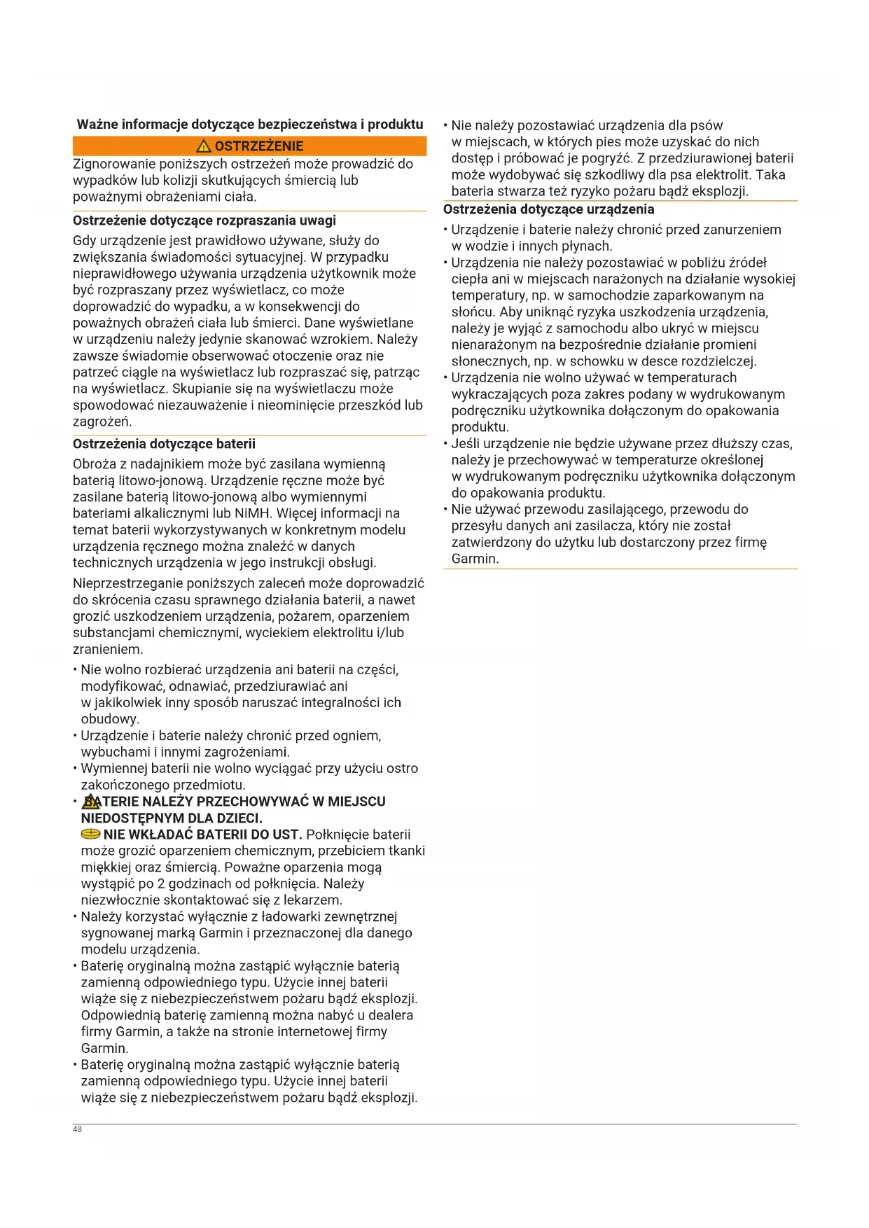 - Zużyte urządzenie/baterię nienadającą się do dalszego użytku należy przekazać do punktu utylizacji i powtórnego przetwarzania odpadów zgodnie z prawem i przepisami obowiązującymi na danym obszarze. Uwaga dotycząca systemu GPS Może dojść do pogorszenia wydajności pracy urządzenia nawigacyjnego, jeśli w jego pobliżu znajdują się jakiekolwiek urządzenia korzystające z naziemnej sieci szerokopasmowej o częstotliwościach zbliżonych do częstotliwości systemu GNSS (globalnego systemu nawigacji satelitarnej), jak na przykład usługi GPS. Korzystanie z takich urządzeń może niekorzystnie wpływać na odbiór sygnałów GNSS. Programy ochrony środowiska dotyczące produktu Informacje na temat programu recyklingu produktu firmy Garmin oraz dyrektyw WEEE, RoHS i REACH, a także innych programów można znaleźć na stronie www.garmin.com/aboutGarmin/environment. 49Deklaracja zgodności Firma Garmin niniejszym oświadcza, że produkt ten spełnia wymagania dyrektywy 2014/53/UE. Pełny tekst deklaracji zgodności z przepisami unijnymi można znaleźć na stronie: www.garmin.com/compliance. Informacje o radiu VHF Urządzenie to korzysta ze ściśle określonych częstotliwości radiowych, które różnią się w zależności od kraju użytkowania produktu. Urządzenie ręczne i nadajnik mają możliwość zainstalowania innej anteny przez użytkownika. Zmiana anteny może poprawić działanie komunikacji radiowej oraz zapewnić silniejszy sygnał nadawania. Urządzenia nie można używać z anteną innego producenta ani z anteną, która nie została zatwierdzona przez firmę Garmin. Odwiedź stronę www.garmin.com/tracking-legal, aby uzyskać informacje na temat działania tego produktu i używanej przez niego częstotliwości radiowej, a także oryginalnych akcesoriów i ograniczeń mocy nadajników obowiązujących w poszczególnych krajach. Dane kartograficzne Firma Garmin wykorzystujemy różne rządowe i prywatne źródła danych. Praktycznie wszystkie źródła danych zawierają pewne niedokładne lub niepełne informacje. W niektórych krajach pełne i dokładne dane kartograficzne nie są dostępne lub ich cena jest zbyt wysoka. Ograniczona gwarancja Niniejsza gwarancja Garmin jest gwarancją producenta, która przenosi na konsumenta prawa niezależne od praw wynikających z praw ochrony konsumenta (rękojmia), przy czym niniejszy dokument tych ostatnich nie ogranicza ani nie wyklucza. Niniejsza gwarancja pozostaje w mocy przez okres dwóch (2) lat od daty zakupu produktu Garmin w Polsce. Prawa ochrony konsumenta: W razie wykrycia wady produktu Garmin, konsument może skorzystać z praw wynikających z następujących przepisów: