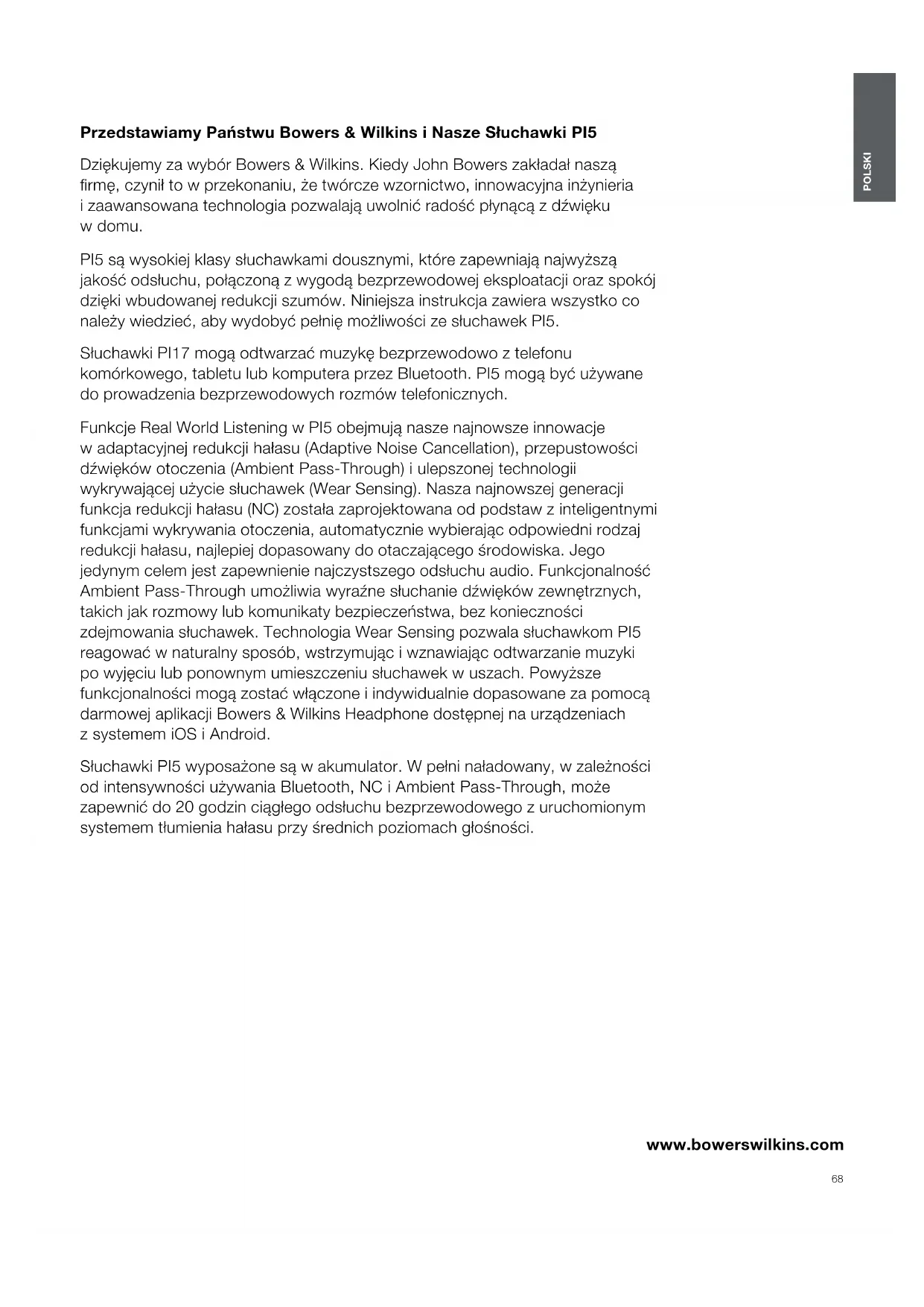 A fejhallgató használata67 MAGYAR Műszakiadatok Technikai jellemzők Ig azi vezeték nélküli technológia Bluetooth 5.0, AptX Adaptive technológiával Auto ANC Vezeték nélküli és USB-C töltés Gyors töltés támogatás Bluetooth kodekek AptX AAC SBC Bluetooth prolok A2DP v1.3.1 AVRCP v1.6.1 HFP v1.7.1 HSP v1.2 BLE GATT (Generic Attribute Prole) Frekvencia sáv Tx mód: 2402MHz - 480MHZ, ISM sáv Rx mód: 2402MHz - 2480MHz, ISM sáv RF kimenő teljesítmény < 10.0 dBm Meghajtó egységek 9,2 mm dinamikus meghajtó Frekvencia tartomány 10Hz - 20kHz Torzítás (THD) <0.3% (1kHz/10mW) Elem élettartam Maximum 4 óra Bluetooth Töltés 15 perces töltés = 2 óra Bluetooth Bemenetek Bluetooth Súly Fülhallgatók 7g , Töltőtáska 47g68 POLSKI www.bowerswilkins.com PrzedstawiamyPaństwuBowers&WilkinsiNaszeSłuchawkiPI5 Dziękujemy za wybór Bowers & Wilkins. Kiedy John Bowers zakładał naszą rmę, czynił to w przekonaniu, że twórcze wzornictwo, innowacyjna inżynieria i zaawansowana technologia pozwalają uwolnić radość płynącą z dźwięku wdomu. PI5 są wysokiej klasy słuchawkami dousznymi, które zapewniają najwyższą jakość odsłuchu, połączoną z wygodą bezprzewodowej eksploatacji oraz spokój dzięki wbudowanej redukcji szumów. Niniejsza instrukcja zawiera wszystko co należy wiedzieć, aby wydobyć pełnię możliwości ze słuchawek PI5. Słuchawki PI17 mogą odtwarzać muzykę bezprzewodowo z telefonu komórkowego, tabletu lub komputera przez Bluetooth. PI5 mogą być używane do prowadzenia bezprzewodowych rozmów telefonicznych. Funkcje Real World Listening w PI5 obejmują nasze najnowsze innowacje wadaptacyjnej redukcji hałasu (Adaptive Noise Cancellation), przepustowości dźwięków otoczenia (Ambient Pass-Through) i ulepszonej technologii wykrywającej użycie słuchawek (Wear Sensing). Nasza najnowszej generacji funkcja redukcji hałasu (NC) została zaprojektowana od podstaw zinteligentnymi funkcjami wykrywania otoczenia, automatycznie wybierając odpowiedni rodzaj redukcji hałasu, najlepiej dopasowany do otaczającego środowiska. Jego jedynym celem jest zapewnienie najczystszego odsłuchu audio. Funkcjonalność Ambient Pass-Through umożliwia wyraźne słuchanie dźwięków zewnętrznych, takich jak rozmowy lub komunikaty bezpieczeństwa, bez konieczności zdejmowania słuchawek. Technologia Wear Sensing pozwala słuchawkom PI5 reagować w naturalny sposób, wstrzymując i wznawiając odtwarzanie muzyki po wyjęciu lub ponownym umieszczeniu słuchawek wuszach. Powyższe funkcjonalności mogą zostać włączone i indywidualnie dopasowane za pomocą darmowej aplikacji Bowers & Wilkins Headphone dostępnej na urządzeniach zsystemem iOS i Android. Słuchawki PI5 wyposażone są w akumulator. W pełni naładowany, w zależności od intensywności używania Bluetooth, NC i Ambient Pass-Through, może zapewnić do 20 godzin ciągłego odsłuchu bezprzewodowego z uruchomionym systemem tłumienia hałasu przy średnich poziomach głośności. POLSKI Contents POLSKI68 1.ZawartośćopakowaniaPI5 69 2.PoznawaniesłuchawekPI5 69 2.1Włączanie/wyłączaniesłuchawek 69 2.2Sterowaniesłuchawkami 69