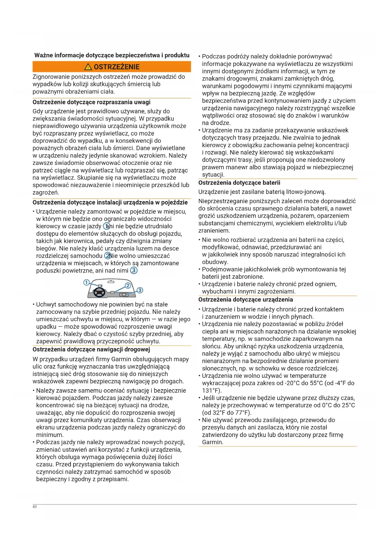 - Ustawa z 23 kwietnia 1964 kodeks cywilny (tekst jednolity Dz.U. poz. 121 z późniejszymi zmianami) Konsumentowi przysługuje prawo wyboru wnoszenia roszczeń z tytułu Ograniczonej Gwarancji Garmin lub praw ochrony konsumenta. Zakres Gwarancji: Niniejsza gwarancja stanowi, że zakupiony produkt Garmin będzie wolny od wszelkich wad produkcyjnych i materiałowych przez okres dwóch lat od daty zakupu. W tym okresie Garmin może wedle własnego uznania naprawić lub wymienić wszelkie komponenty, które zepsują się w warunkach normalnego użytkowania. Rzeczone naprawy lub wymiany zostaną dokonane bez obciążania klienta kosztami części, robocizny i transportu. Niniejsza gwarancja nie ma zastosowania do: (i) uszkodzeń kosmetycznych, np. zadrapań, ubytków i wgnieceń; (ii) elementów eksploatacyjnych, np. baterii, o ile uszkodzenie produktu nie wynika z wady materiałowej lub produkcyjnej; (iii) uszkodzeń spowodowanych wypadkami, nadużyciem, niewłaściwym użytkowaniem, powodzią, pożarem lub innymi zdarzeniami siły wyższej lub czynnikami zewnętrznymi; (iv) uszkodzeń spowodowanych wykonaniem usług przez osoby niebędące autoryzowanymi usługodawcami Garmin; (v) uszkodzeń produktu, który został poddany modyfikacjom lub przeróbkom bez pisemnej zgody Garmin; lub (vi) uszkodzeń produktu, który został podłączony do źródła zasilania i/lub przewodów do transmisji danych, które nie zostały dostarczone przez Garmin. Ponadto Garmin zastrzega sobie prawo do odmowy uznania gwarancji w odniesieniu do produktów lub usług uzyskanych i/lub wykorzystanych z naruszeniem polskiego prawa. Nasze produkty nawigacyjne stanowią wyłącznie pomoc w planowaniu podróży i nie należy ich wykorzystywać do żadnych celów wymagających precyzyjnego pomiaru kierunku, odległości, położenia ani topografii. Garmin nie udziela żadnej gwarancji w zakresie dokładności ani kompletności danych związanych z wgranymi w niniejszym produkcie mapami. Aby skorzystać z obsługi gwarancyjnej należy skontaktować się z lokalnym autoryzowanym dealerem Garmin lub zadzwonić do Działu Wsparcia Technicznego Garmin w celu uzyskania wytycznych co do wysyłki oraz otrzymania numeru reklamacji - RMA. W Polsce usługi Wsparcia Produktu zapewnia Garmin Polska, Adgar Park West I, Al. Jerozolimskie 181, 02-222 Warszawa Polska telefon: 00 800 441 24 54, mail: poland.support@garmin.com Garmin może wedle własnej decyzji naprawić lub wymienić (na nowy lub nowo naprawiony produkt zastępczy) urządzenie lub oprogramowanie lub zaproponować klientowi zwrot pełnej ceny zakupu w ciągu 14 dni od daty otrzymania wadliwego urządzenia. Jeżeli w ramach realizacji swoich zobowiązań Garmin dostarczy klientowi wolne od wad urządzenie, wymieni wadliwe urządzenie lub przeprowadzi znaczące naprawy urządzenia w ramach gwarancji, bieg okresu gwarancji rozpocznie się na nowo od momentu dostarczenia pozbawionego wad urządzenia lub zwrotu naprawionego urządzenia do końca oryginalnego okresu gwarancji. W innych przypadkach okres gwarancji zostanie przedłużony o czas, w którym użytkowanie urządzenia było niemożliwe wskutek wady urządzenia objętej gwarancją. Ograniczenie odpowiedzialności wobec osób trzecich i użytkowników komercyjnych: Garmin w żadnym przypadku nie ponosi odpowiedzialności za żadne straty, które nie zostały spowodowane przez naruszenie niniejszej gwarancji przez Garmin, ani za żadne szkody uboczne, specjalne, pośrednie ani wynikowe, w tym za utratę danych, utratę zysków lub utratę sposobności, niezależnie od tego, czy wynikają one z użycia, niewłaściwego użytkowania lub niemożności użycia niniejszego produktu czy z wad produktu. Niniejsze ograniczenie nie ma zastosowania do (i) zgonu lub szkód cielesnych; (ii) oszustwa; (iii) świadomego wprowadzenia w błąd; lub (iv) innych rodzajów odpowiedzialności, których z mocy prawa nie można ograniczyć ani wykluczyć. Garmin nie gwarantuje, nie oświadcza i nie zapewnia, że będzie w stanie naprawić lub wymienić każdy produkt Garmin na mocy niniejszej gwarancji bez ryzyka związanego z informacjami i/lub danymi przechowywanymi na urządzeniu Garmin i/lub ich utraty. Prywatność: Wszelkie informacje dotyczące klienta otrzymane w procesie gwarancyjnym będą przechowywane przez Garmin zgodnie z Polityką Prywatności Garmin, z którą można się zapoznać pod adresem www.garmin.com/pl-PL/legal/privacy-statement Istotne ograniczenia usług: Garmin może ograniczyć świadczenie usług do terytorium EOG i Szwajcarii. Usługi serwisowe w odniesieniu do produktów Garmin może świadczyć wyłącznie Garmin lub autoryzowane Centra Serwisowe Garmin Zakupy na aukcjach internetowych: Produkty zakupione na aukcjach internetowych nie podlegają ochronie gwarancyjnej Garmin. Potwierdzenia zakupu w ramach aukcji internetowych nie będą przyjmowane w celu weryfikacji gwarancji. W większości przypadków w celu skorzystania z usług gwarancyjnych niezbędny jest dowód zakupu od pierwotnego sprzedawcy. 42Ogólne: Jeżeli jakikolwiek zapis niniejszej gwarancji uznany zostanie za niezgodny z prawem lub niewykonalny, zostanie wyłączony z niniejszej gwarancji, co pozostaje bez wpływu dla zgodności z prawem i wykonalności pozostałych warunków gwarancji. 43Důležité bezpečnostní informace a informace o produktu VAROVÁNÍ Pokud nebudete věnovat pozornost následujícím varováním, můžete se vystavit nebezpečí nehody nebo kolize, která může vést ke smrti nebo vážnému zranění. Varování před nepozorností Toto zařízení je navrženo tak, aby při správném používání zvyšovalo přehled o situaci na silnici. Při nesprávném použití může displej zařízení odvést vaši pozornost, což může mít za následek nehodu, která může vést ke smrti nebo vážnému zranění. Informace zobrazené na zařízení kontrolujte jedním pohledem. Vždy věnujte pozornost okolí, nesledu