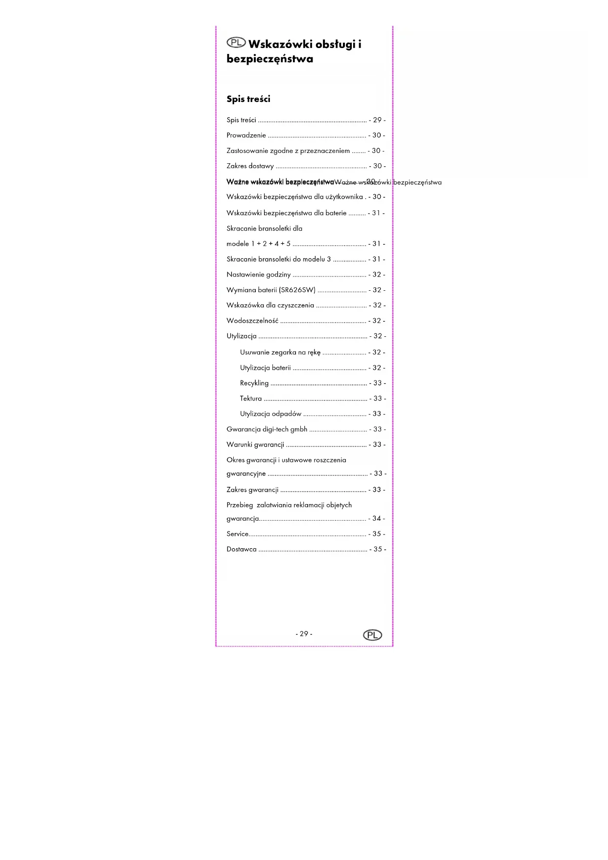 Wskazówki obsługi i bezpieczęństwa Spis treści Spis treści .............................................................. - 29 - Prowadzenie ........................................................ - 30 - Zastosowanie zgodne z przeznaczeniem ........ - 30 - Zakres dostawy .................................................... - 30 - Ważne wskazówki bezpieczęństwa Ważne wskazówki bezpieczęństwaWażne wskazówki bezpieczęństwa Ważne wskazówki bezpieczęństwa .............. - 30 - Wskazówki bezpieczęństwa dla użytkownika . - 30 - Wskazówki bezpieczęństwa dla baterie .......... - 31 - Skracanie bransoletki dla modele 1 + 2 + 4 + 5 .......................................... - 31 - Skracanie bransoletki do modelu 3 ................... - 31 - Nastawienie godziny .......................................... - 32 - Wymiana baterii (SR626SW) ............................ - 32 - Wskazówka dla czyszczenia ............................. - 32 - Wodoszczelność ................................................. - 32 - Utylizacja .............................................................. - 32 - Usuwanie zegarka na rękę ......................... - 32 - Utylizacja baterii .......................................... - 32 - Recykling ....................................................... - 33 - Tektura ........................................................... - 33 - Utylizacja odpadów .................................... - 33 - Gwarancja digi-tech gmbh ................................. - 33 - Warunki gwarancji .............................................. - 33 - Okres gwarancji i ustawowe roszczenia gwarancyjne ......................................................... - 33 - Zakres gwarancji ................................................. - 33 - Przebieg zalatwiania reklamacji objetych gwarancja............................................................. - 34 - Service................................................................... - 35 - Dostawca .............................................................. - 35 --