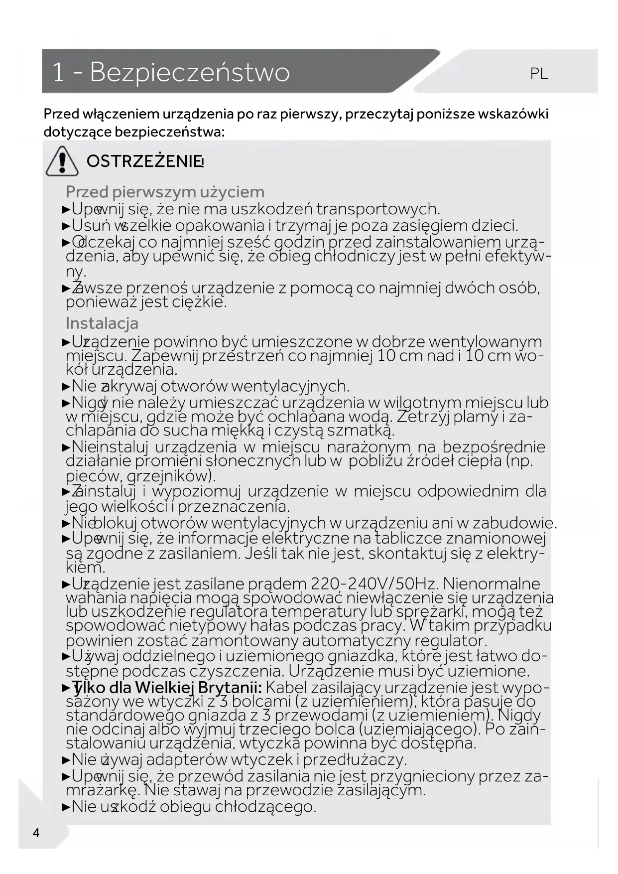 zed pierwszym użyciem ▶ Upe wnij się, że nie ma uszkodzeń transportowych. ▶ Usuń w szelkie opakowania i trzymaj je poza zasięgiem dzieci. ▶ O dczekaj co najmniej sześć godzin przed zainstalowaniem urzą- dzenia, aby upewnić się, że obieg chłodniczy jest w pełni efektyw- ny. ▶ Z awsze przenoś urządzenie z pomocą co najmniej dwóch osób, ponieważ jest ciężkie. Instalacja ▶ Ur ządzenie powinno być umieszczone w dobrze wentylowanym miejscu. Zapewnij przestrzeń co najmniej 10 cm nad i 10 cm wo- kół urządzenia. ▶ Nie z akrywaj otworów wentylacyjnych. ▶ Nigd y nie należy umieszczać urządzenia w wilgotnym miejscu lub w miejscu, gdzie może być ochlapana wodą. Zetrzyj plamy i za- chlapania do sucha miękką i czystą szmatką. ▶ Nie instaluj urządzenia w miejscu narażonym na bezpośrednie działanie promieni słonecznych lub w pobliżu źródeł ciepła (np. pieców, grzejników). ▶ Z ainstaluj i wypoziomuj urządzenie w miejscu odpowiednim dla jego wielkości i przeznaczenia. ▶ Nie blokuj otworów wentylacyjnych w urządzeniu ani w zabudowie. ▶ Upe wnij się, że informacje elektryczne na tabliczce znamionowej są zgodne z zasilaniem. Jeśli tak nie jest, skontaktuj się z elektry- kiem. ▶ Ur ządzenie jest zasilane prądem 220-240V/50Hz. Nienormalne wahania napięcia mogą spowodować niewłączenie się urządzenia lub uszkodzenie regulatora temperatury lub sprężarki, mogą też spowodować nietypowy hałas podczas pracy. W takim przypadku powinien zostać zamontowany automatyczny regulator. ▶ Uż ywaj oddzielnego i uziemionego gniazdka, które jest łatwo do- stępne podczas czyszczenia. Urządzenie musi być uziemione. ▶ T ylko dla Wielkiej Brytanii: Kabel zasilający urządzenie jest wypo- sażony we wtyczki z 3 bolcami (z uziemieniem), która pasuje do standardowego gniazda z 3 przewodami (z uziemieniem). Nigdy nie odcinaj albo wyjmuj trzeciego bolca (uziemiającego). Po zain- stalowaniu urządzenia, wtyczka powinna być dostępna. ▶ Nie u żywaj adapterów wtyczek i przedłużaczy. ▶ Upe wnij się, że przewód zasilania nie jest przygnieciony przez za- mrażarkę. Nie stawaj na przewodzie zasilającym. ▶ Nie us zkodź obiegu chłodzącego.
