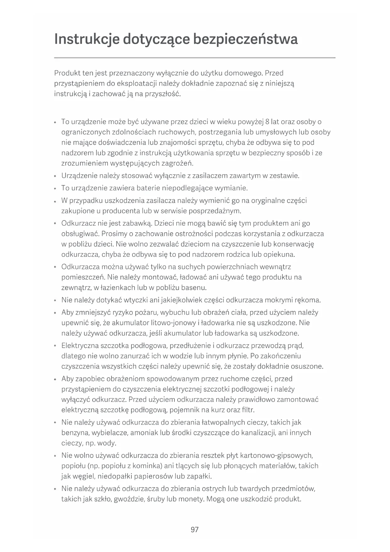 Литий-ионный аккумулятор содержит химические вещества, представляющие опасность для окружающей среды. Перед утилизацией пылесоса сначала выньте аккумулятор и утилизируйте или сдайте его на переработку в соответствии с местными законами и правилами страны или региона эксплуатации. Примечание. Перед извлечением батареи пылесос необходимо выключить. Батарею следует утилизировать безопасным способом.97 Instrukcje dotyczące bezpieczeństwa Produkt ten jest przeznaczony wyłącznie do użytku domowego. Przed przystąpieniem do eksploatacji należy dokładnie zapoznać się z niniejszą instrukcją i zachować ją na przyszłość. To urządzenie może być używane przez dzieci w wieku powyżej 8 lat oraz osoby o ograniczonych zdolnościach ruchowych, postrzegania lub umysłowych lub osoby nie mające doświadczenia lub znajomości sprzętu, chyba że odbywa się to pod nadzorem lub zgodnie z instrukcją użytkowania sprzętu w bezpieczny sposób i ze zrozumieniem występujących zagrożeń. Urządzenie należy stosować wyłącznie z zasilaczem zawartym w zestawie. To urządzenie zawiera baterie niepodlegające wymianie. W przypadku uszkodzenia zasilacza należy wymienić go na oryginalne części zakupione u producenta lub w serwisie posprzedażnym. Odkurzacz nie jest zabawką. Dzieci nie mogą bawić się tym produktem ani go obsługiwać. Prosimy o zachowanie ostrożności podczas korzystania z odkurzacza w pobliżu dzieci. Nie wolno zezwalać dzieciom na czyszczenie lub konserwację odkurzacza, chyba że odbywa się to pod nadzorem rodzica lub opiekuna. Odkurzacza można używać tylko na suchych powierzchniach wewnątrz pomieszczeń. Nie należy montować, ładować ani używać tego produktu na zewnątrz, w łazienkach lub w pobliżu basenu. Nie należy dotykać wtyczki ani jakiejkolwiek części odkurzacza mokrymi rękoma. Aby zmniejszyć ryzyko pożaru, wybuchu lub obrażeń ciała, przed użyciem należy upewnić się, że akumulator litowo-jonowy i ładowarka nie są uszkodzone. Nie należy używać odkurzacza, jeśli akumulator lub ładowarka są uszkodzone. Elektryczna szczotka podłogowa, przedłużenie i odkurzacz przewodzą prąd, dlatego nie wolno zanurzać ich w wodzie lub innym płynie. Po zakończeniu czyszczenia wszystkich części należy upewnić się, że zostały dokładnie osuszone. Aby zapobiec obrażeniom spowodowanym przez ruchome części, przed przystąpieniem do czyszczenia elektrycznej szczotki podłogowej i należy wyłączyć odkurzacz. Przed użyciem odkurzacza należy prawidłowo zamontować elektryczną szczotkę podłogową, pojemnik na kurz oraz filtr. Nie należy używać odkurzacza do zbierania łatwopalnych cieczy, takich jak benzyna, wybielacze, amoniak lub środki czyszczące do kanalizacji, ani innych cieczy, np. wody. Nie wolno używać odkurzacza do zbierania resztek płyt kartonowo-gipsowych, popiołu (np. popiołu z kominka) ani tlących się lub płonących materiałów, takich jak węgiel, niedopałki papierosów lub zapałki. Nie należy używać odkurzacza do zbierania ostrych lub twardych przedmiotów, takich jak szkło, gwoździe, śruby lub monety. Mogą one uszkodzić produkt.98 Niniejszym firma Guangdong Deerma Technology Co., Ltd. deklaruje zgodność produktu z wymogami odpowiednich dyrektyw oraz norm europejskich wraz ze zmianami. Pełny tekst deklaracji zgodności UE jest dostępny na następującej stronie internetowej: hp://www.mi.com/global/service/support/declaration.html Włosy, luźne elementy odzieży, palce i inne części ciała należy trzymać z dala od otworów i ruchomych elementów odkurzacza. Nie należy kierować otworu ssącego, przedłużenia lub innych akcesoriów w stronę oczu lub uszu ani wkładać ich do ust. Nie należy wkładać żadnych przedmiotów do otworów odkurzacza ani używać odkurzacza z zatkanym otworem. Chronić przed kurzem, włóknami, włosami i innymi przedmiotami, które mogą ograniczać przepływ powietrza. Nie opierać odkurzacza o krzesło, stół lub inne niestabilne powierzchnie, ponieważ może to spowodować uszkodzenie produktu lub obrażenia ciała. Jeśli odkurzacz nie działa prawidłowo po przewróceniu lub uszkodzeniu, należy skontaktować się z autoryzowanym serwisem. Nigdy nie należy podejmować samodzielnych prób rozebrania odkurzacza. Do ładowania produktu w środowisku o temperaturze otoczenia od 0°C do 35°C należy używać wyłącznie oryginalnej ładowarki. W przeciwnym razie może dojść do uszkodzenia akumulatora. Przed użyciem odkurzacza należy prawidłowo zamontować pojemnik na kurz, bawełniany materiał filtra, separator cyklonowy oraz filtr. Należy upewnić się, że odkurzacz jest odłączony od zasilania, gdy nie jest używany przez dłuższy czas, a także przed wykonaniem jakiejkolwiek konserwacji lub naprawy. Należy zachować szczególną ostrożność podczas używania odkurzacza do sprzątania schodów. OSTRZEŻENIE: Nie stosować w filtrze odkurzacza żadnych substancji zapachowych. Tego typu produkty zawierają łatwopalne substancje chemiczne, które mogą spowodować zapalenie się odkurzacza. NIE wystawiać urządzenia na działanie ognia, ponieważ może to spowodować wybuch. NIE zanurzać urządzenia w słodkiej ani słonej wodzie lub w innych płynach oraz nie narażać go na działanie takich płynów. Podczas korzystania z odkurzacza należy ściśle przestrzegać wskazówek zawartych w niniejszej instrukcji obsługi. Użytkownicy są odpowiedzialni za wszelkie straty lub szkody wynikające z niewłaściwego użytkowania odkurzacza. Szczegółową elektroniczną instrukcję obsługi można