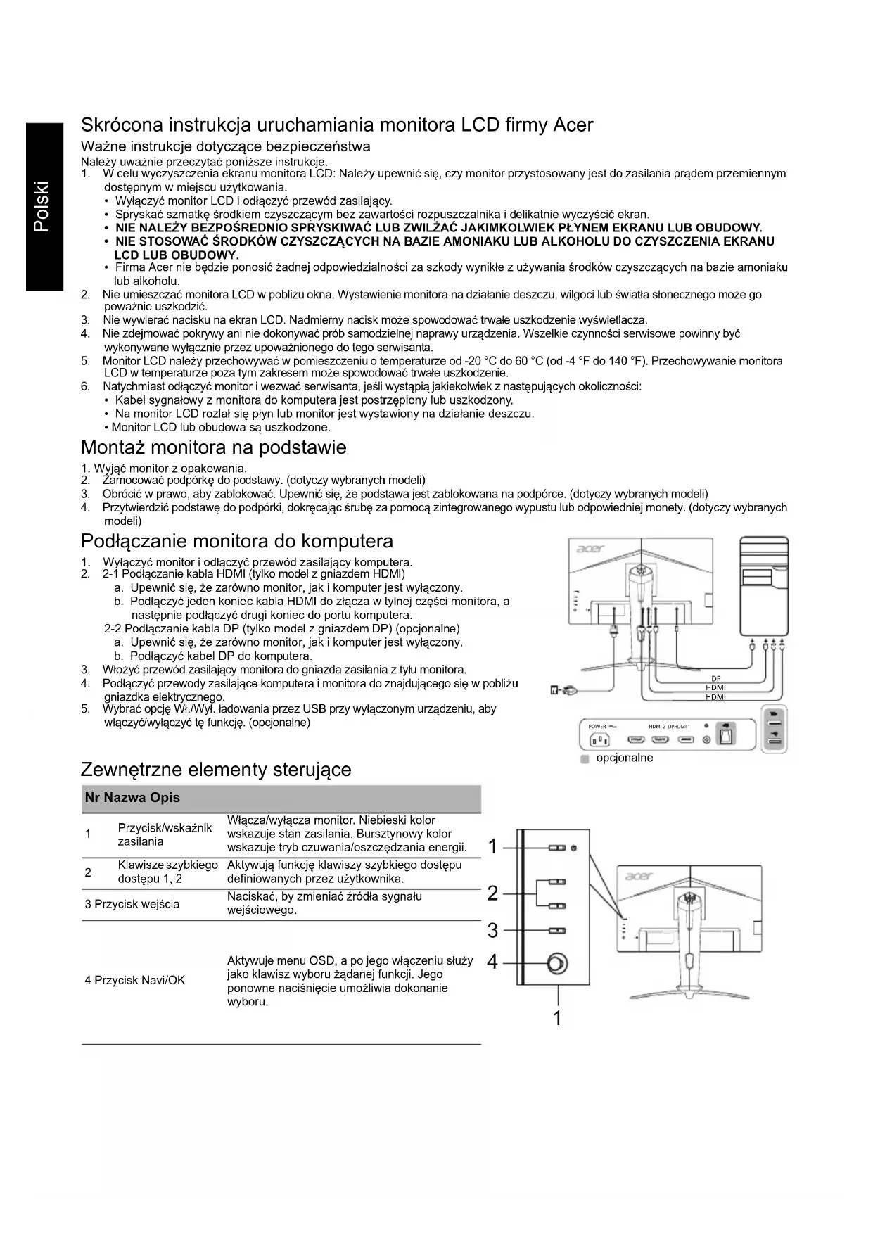 - Roczny pobór energii 39 (kWh) (dotyczy modelu z wejściem HDMI) Pobór mocy (przy 200 nitach) Tryb włączenia 22,0 W (typowy) Tryb uśpienia 0,45 W (typowy) Tryb wyłączenia 0,25 W (typowy) Złącze wejściowe HDMI (tylko model z wejściem HDMI) DP (tylko model z wejściem DP) Wejściowy sygnał wideo HDMI (tylko model z wejściem HDMI) (opcjonalne) DP (tylko model z wejściem DP) (opcjonalne) Głośniki 2 W x 2 (tylko model z wejściem audio) (opcjonalne) USB USB 3.0 x 2 (opcjonalne) Maksymalny rozmiar ekranu W poziomie: 543,744 mm W pionie: 302,616 mm Źródło zasilania 100–240 V, 50/60 Hz Kwestie środowiskowe Temperatura pracy: Od 0° do 40°C Temperatura przechowywania: Od -20° do 60°C Wilgotność otoczenia podczas pracy: Od 20% do 80% Wymiary 557,79 (szer.) × 397,84 ~ 512,84 (wys.) × 236,27 (głęb.) mm Waga: 5,30 kg (netto) Specyfikacje mechanizmów Pochylenie: Od -5° do +25° (tylko w najwyższym punkcie dost ępne jest 25 stopni odchylenia dla kąta wzniesienia) Obrót: Od -20° do +20° Regulacja wysokości: Od 0mm do 115mm Obrót w pionie: Od -90° do +90° Zdejmowalna podpórka: Tak Zewnętrzne elementy sterujące Przełącznik/przyciski Przycisk zasilania Klawisz szybkiego dostępu 1 Klawisz szybkiego dostępu 2 Wejście Menu/Navi/OK Funkcje Jasność Kontrast Nieb. światło Wzmocn. czerni ACM HDR Super ostrość Gamma Temp. koloru Tryby Przestrz. kolor. Tryb odc. szar. 6-osiowa barwa Nasyc. 6-osiow Głośność Wyciszenie Over Drive Adaptive-Sync Częst. odśwież. VRB Bardzo małe opóźnienie Cel Język Wyłączenie OSD Przezroczystość Blokada OSD Wejście Światło otocz. Autom. źródło Format DP Przypis. przyc. skrótu Tryb szeroki DDC/CI Poz. czarn. HDMI Tryb szyb. uruch Over Clock# Ładowania przez USB po rozładowaniu Wyświetlanie informacji Resetuj wszyst. ustaw. Zakończ Dane techniczne zależą od modelu i/lub regionu.Português Manual de início rápido (QSG) do monitor LCD da Acer Instruções de segurança importantes Leia atentamente as instruções que se seguem. 1. Para limpar o ecrã do monitor LCD: certifique-se de que o monitor tem a potência elétrica necessária para funcionar com a alimentação de CA disponível na sua localização.