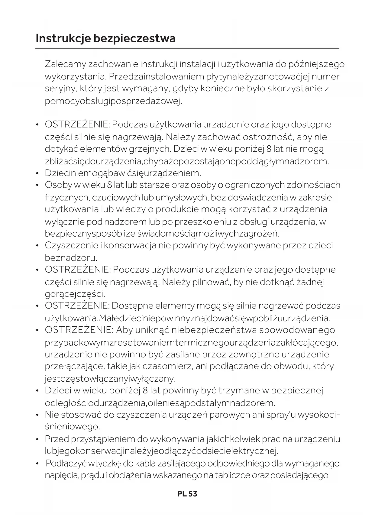 - Los RAEE debenllevarse aáreas derecolección específicas gestionadas por el ayuntamiento o porunaempresa registrada.PL 53 OSTRZEŻENIE: Podczas użytkowania urządzenie oraz jego dostępne części silnie się nagrzewają. Należy pilnować, by nie dotknąć żadnej gorącejczęści. OSTRZEŻENIE: Aby uniknąć niebezpieczeństwa spowodowanego przypadkowymzresetowaniemtermicznegourządzeniazakłócającego, urządzenie nie powinno być zasilane przez zewnętrzne urządzenie przełączające, takie jak czasomierz, ani podłączane do obwodu, który jestczęstowłączanyiwyłączany. Zalecamy zachowanie instrukcji instalacji i użytkowania do późniejszego wykorzystania. Przedzainstalowaniem płytynależyzanotowaćjej numer seryjny, który jest wymagany, gdyby konieczne było skorzystanie z pomocyobsługiposprzedażowej. OSTRZEŻENIE: Podczas użytkowania urządzenie oraz jego dostępne części silnie się nagrzewają. Należy zachować ostrożność, aby nie dotykać elementów grzejnych. Dzieci w wieku poniżej 8 lat nie mogą zbliżaćsiędourządzenia,chybażepozostająonepodciągłymnadzorem. Dzieciniemogąbawićsięurządzeniem. Osoby w wieku 8 lat lub starsze oraz osoby o ograniczonych zdolnościach fizycznych, czuciowych lub umysłowych, bez doświadczenia w zakresie użytkowania lub wiedzy o produkcie mogą korzystać z urządzenia wyłącznie pod nadzorem lub po przeszkoleniu z obsługi urządzenia, w bezpiecznysposób ize świadomościąmożliwychzagrożeń. Czyszczenie i konserwacja nie powinny być wykonywane przez dzieci beznadzoru. OSTRZEŻENIE: Dostępne elementy mogą się silnie nagrzewać podczas użytkowania.Małedzieciniepowinnyznajdowaćsięwpobliżuurządzenia. Nie stosować do czyszczenia urządzeń parowych ani spray'u wysokoci- śnieniowego. Przed przystąpieniem do wykonywania jakichkolwiek prac na urządzeniu lubjegokonserwacjinależyjeodłączyćodsiecielektrycznej. Dzieci w wieku poniżej 8 lat powinny być trzymane w bezpiecznej odległościodurządzenia,oileniesąpodstałymnadzorem. Podłączyć wtyczkę do kabla zasilającego odpowiedniego dla wymaganego napięcia,prądui obciążenia wskazanegona tabliczce orazposiadającego Instrukcje bezpieczestwa
