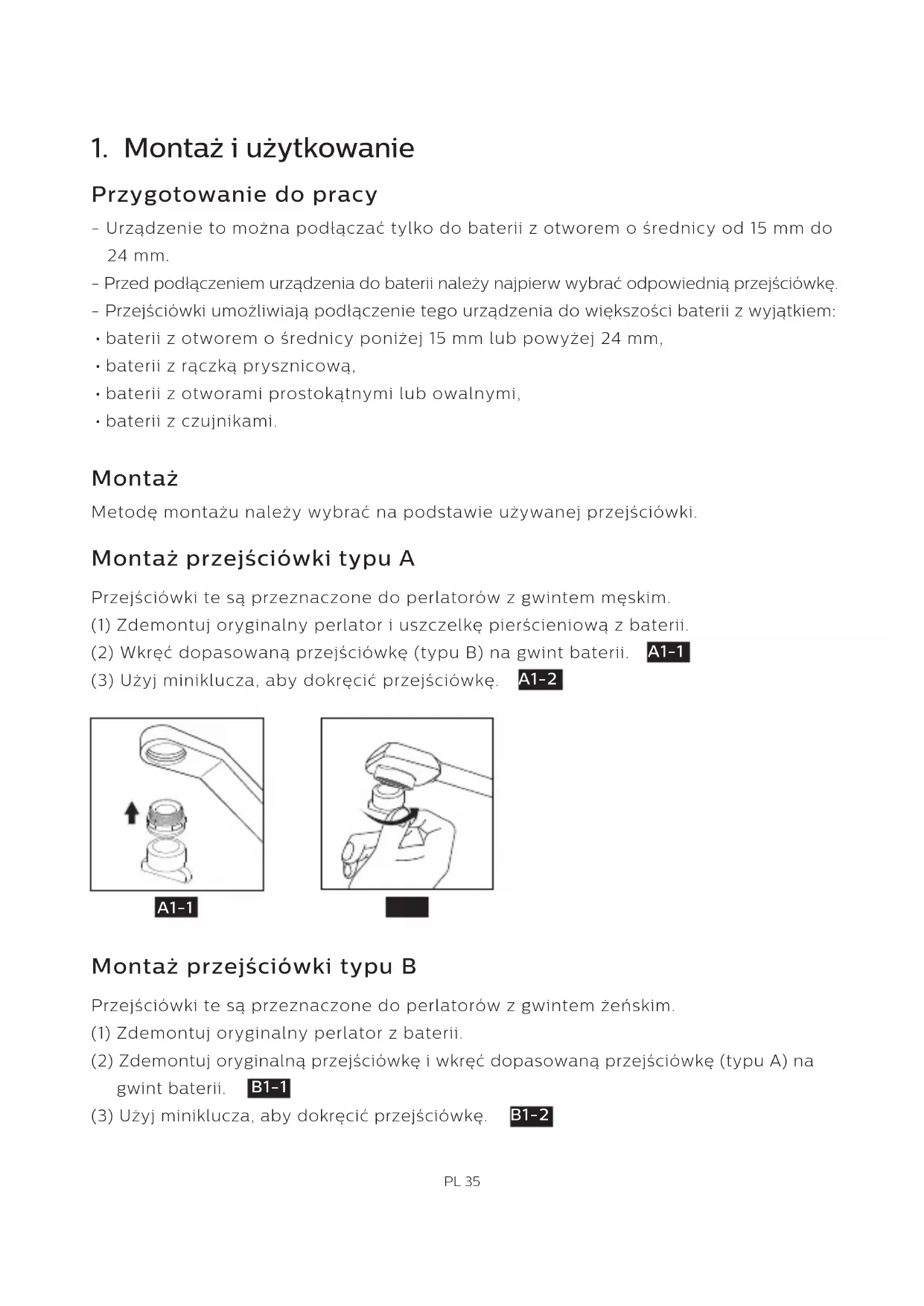 - baterii z czujnikami. Montaż Przygotowanie do pracy Metodę montażu należy wybrać na podstawie używanej przejściówki. Montaż przejściówki typu A Przejściówki te są przeznaczone do perlatorów z gwintem męskim. (1) Zdemontuj oryginalny perlator i uszczelkę pierścieniową z baterii. (2) Wkręć dopasowaną przejściówkę (typu B) na gwint baterii. (3) Użyj miniklucza, aby dokręcić przejściówkę. Montaż przejściówki typu B Przejściówki te są przeznaczone do perlatorów z gwintem żeńskim. (1) Zdemontuj oryginalny perlator z baterii. (2) Zdemontuj oryginalną przejściówkę i wkręć dopasowaną przejściówkę (typu A) na gwint baterii. (3) Użyj miniklucza, aby dokręcić przejściówkę. PL 35 B1-1 B1-2 A1-1 A1-1 A1-2 A1-2Montaż przejściówki typu C Przejściówki te są przeznaczone do baterii innych niż typu A lub B z otworem o średnicy od 15 do 21 mm. Przed przystąpieniem do montażu przygotuj wkrętak z końcówką płaską. Przejściówka typu C (1) Przygotuj uszczelkę pierścieniową wewnętrzną lub zewnętrzną przejściówki typu C w zależności od wymiarów otworu baterii. (2) Połącz przejściówkę typu A z przejściówką typu C. (3) Wyreguluj połączone przejściówki i wkręć je na gwint baterii.