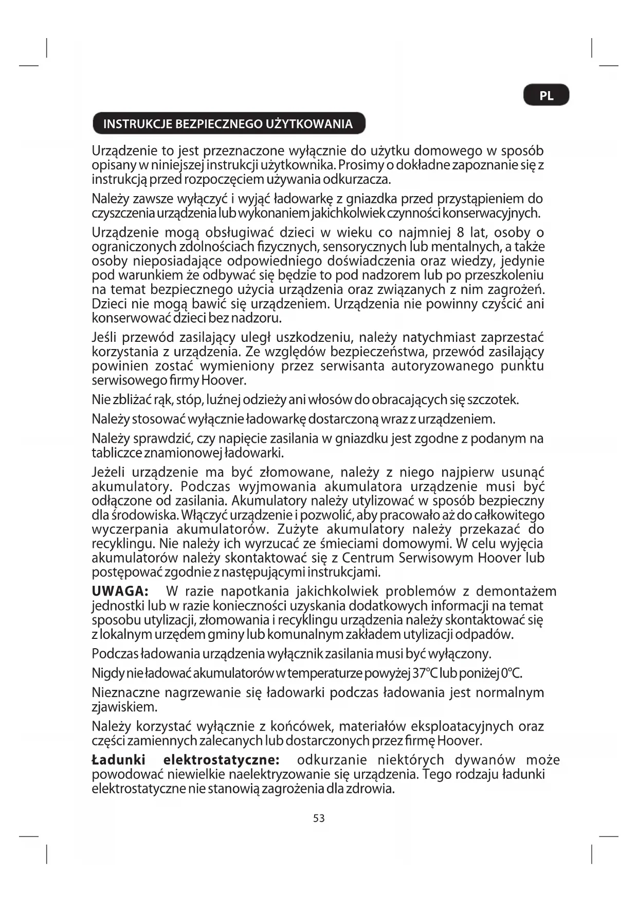 Urządzenie to jest przeznaczone wyłącznie do użytku domowego w sposób opisany w niniejszej instrukcji użytkownika. Prosimy o dokładne zapoznanie się z instrukcją przed rozpoczęciem używania odkurzacza. Należy zawsze wyłączyć i wyjąć ładowarkę z gniazdka przed przystąpieniem do czyszczenia urządzenia lub wykonaniem jakichkolwiek czynności konserwacyjnych. Urządzenie mogą obsługiwać dzieci w wieku co najmniej 8 lat, osoby o ograniczonych zdolnościach fizycznych, sensorycznych lub mentalnych, a także osoby nieposiadające odpowiedniego doświadczenia oraz wiedzy, jedynie pod warunkiem że odbywać się będzie to pod nadzorem lub po przeszkoleniu na temat bezpiecznego użycia urządzenia oraz związanych z nim zagrożeń. Dzieci nie mogą bawić się urządzeniem. Urządzenia nie powinny czyścić ani konserwować dzieci bez nadzoru. Jeśli przewód zasilający uległ uszkodzeniu, należy natychmiast zaprzestać korzystania z urządzenia. Ze względów bezpieczeństwa, przewód zasilający powinien zostać wymieniony przez serwisanta autoryzowanego punktu serwisowego firmy Hoover. Nie zbliżać rąk, stóp, luźnej odzieży ani włosów do obracających się szczotek. Należy stosować wyłącznie ładowarkę dostarczoną wraz z urządzeniem. Należy sprawdzić, czy napięcie zasilania w gniazdku jest zgodne z podanym na tabliczce znamionowej ładowarki. Jeżeli urządzenie ma być złomowane, należy z niego najpierw usunąć akumulatory. Podczas wyjmowania akumulatora urządzenie musi być odłączone od zasilania. Akumulatory należy utylizować w sposób bezpieczny dla środowiska. Włączyć urządzenie i pozwolić, aby pracowało aż do całkowitego wyczerpania akumulatorów. Zużyte akumulatory należy przekazać do recyklingu. Nie należy ich wyrzucać ze śmieciami domowymi. W celu wyjęcia akumulatorów należy skontaktować się z Centrum Serwisowym Hoover lub postępować zgodnie z następującymi instrukcjami. UwAGA: W razie napotkania jakichkolwiek problemów z demontażem jednostki lub w razie konieczności uzyskania dodatkowych informacji na temat sposobu utylizacji, złomowania i recyklingu urządzenia należy skontaktować się z lokalnym urzędem gminy lub komunalnym zakładem utylizacji odpadów. Podczas ładowania urządzenia wyłącznik zasilania musi być wyłączony. Nigdy nie ładować akumulatorów w temperaturze powyżej 37°C lub poniżej 0°C. Nieznaczne nagrzewanie się ładowarki podczas ładowania jest normalnym zjawiskiem. Należy korzystać wyłącznie z końcówek, materiałów eksploatacyjnych oraz części zamiennych zalecanych lub dostarczonych przez firmę Hoover. Ładunki elektrostatyczne: odkurzanie niektórych dywanów może powodować niewielkie naelektryzowanie się urządzenia. Tego rodzaju ładunki elektrostatyczne nie stanowią zagrożenia dla zdrowia.PRZygOTOWANIE ODKURZACZA KOMPONENTy URZĄDZENIA Obudowagłównaodkurzacza A. Szczotka dywanowo-podłogowa B. Obudowa C. Ręczny przycisk zwalniający D. Przycisk zwalniania uchwytu E. Wyłącznik F. Stojak / uchwyt G. Ładowarka H. Zespół przenośny
