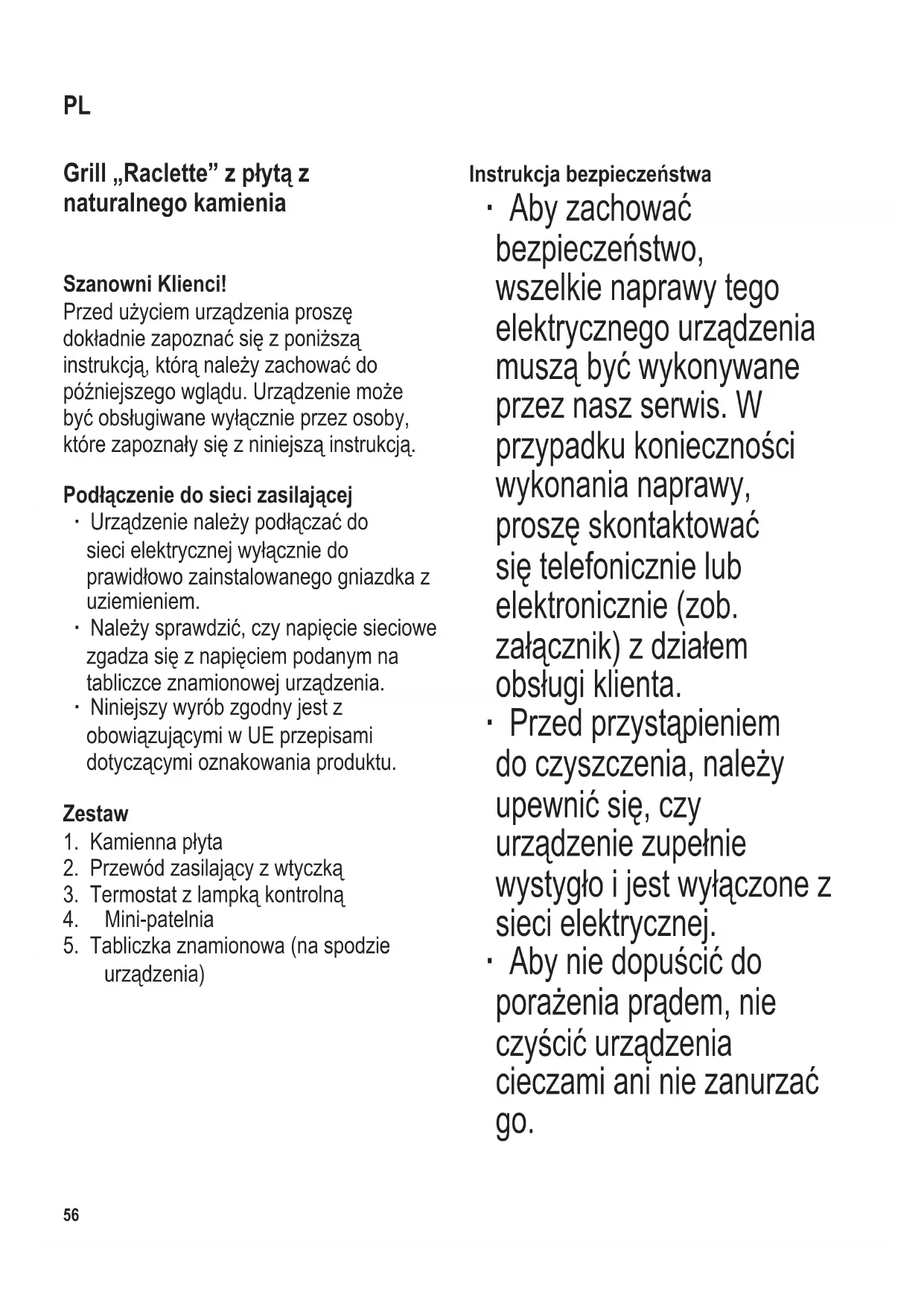 Zastosowanie Urządzenie to jest elektrycznym grillem raclette przeznaczonym do grillowania chudego mięsa, ryb i warzyw oraz przyrządzania sera „au gratin”. Każdy inne użycie urządzenia niż opisane w niniejszej instrukcji jest nieprawidłowe i może doprowadzić do obrażeń ciała lub szkód materialnych. Przed pierwszym użyciem ∙ Zdjąć wszystkie elementy opakowania. ∙ Przed pierwszym użyciem urządzenia wyczyścić płytę kamienną i mini-patelnie przy użyciu wilgotnej ściereczki. ∙ Włączyć urządzenie z nałożoną płytą grillową oraz wsuniętymi mini-patelniami na około 10 minut bez żywności w celu pozbycia się specycznego zapachu, jaki pojawia się przy pierwszym włączeniu grilla (może się też pojawić nieco dymu). Z tego względu należy zapewnić w pomieszczeniu odpowiednią wentylację, otwierając okna lub drzwi balkonowe. ∙ Wyczyścić następnie urządzenie zgodnie z instrukcją zamieszczoną w punkcie Czyszczenie i konserwacja. Kamienna płyta ∙ Przed uruchomieniem urządzenia, ułożyć na urządzeniu kamienną płytę, wypolerowaną stroną w górę. ∙ Ostrzeżenie: Nie należy kłaść zimnej płyty na gorącym elemencie grzewczym. ∙ Kamienną płytę można używać do pieczenia/smażenia warzyw, plasterków mięsa, ryb itp. ∙ Płyta kamienna wykonana jest z naturalnego materiału. Niewielkie pęknięcia wynikające z naturalnego rozkurczania i skurczania się płyty podczas ogrzewania i stygnięcia urządzenia są zjawiskiem normalnym, podobnie jak zmiana barwy na ciemniejszą. Nie ma to negatywnego wpływu na pracę urządzenia. ∙ Na płycie kamiennej nie należy umieszczać zamrożonej żywności ani produktów zawierających cukier (jak np. korniszony czy musztarda). Regulowany termostat ze wskaźnikiem świetlnym ∙ Termostat służy do regulowania temperatury pomiędzy poziomami MIN a MAX. ∙ Lampka kontrolna informuje o tym, czy włączony jest w danej chwili element grzejny: Ogrzewanie włączone = lampka włączona Ogrzewanie wyłączone = lampka wyłączona ∙ Po zakończeniu pracy, ustawić termostat na najniższą temperaturę i wyjąć wtyczkę z gniazdka elektrycznego.60 104 x 142 mm Instrukcja obsługi Porada: Aby grillowane mięso wyszło jak najlepiej, należy wyjąć je z lodówki około 30 minut wcześniej i odstawić na przykrytym talerzu. ∙ Ułożyć na urządzeniu kamienną płytę. ∙ Włożyć wtyczkę do kontaktu elektrycznego i przekręcić termostat maksymalnie w prawo. ∙ Pozostawić urządzenie na około 10 minut, aby płyty osiągnęły odpowiednią temperaturę. Użycie płyty kamiennej wymaga rozgrzewania przez około 25 minut. ∙ Umieścić produkt przeznaczony do przygotowania na kamiennej. ∙ Do mini-patelni włożyć ser raclette. Włożyć mini-patelnie pod element grzewczy i zostawić je tak długo, aż ser się rozpuści. ∙ Ostrzeżenie: Nie wkładać pustych mini-patelni do włączonego urządzenia. ∙ Po zakończeniu pracy, przekręcić regulator termostatu maksymalnie w lewo i wyjąć wtyczkę z kontaktu. Jak przyrządzić ser raclette Użyć od 200 do 300 gramów sera na osobę. Pokroić ser na plasterki o grubości od 3 do 5 mm i ułożyć je na mini- patelniach. Najlepiej użyć oryginalnego sera „Raclette”, aczkolwiek można użyć każdego innego sera, który szybko się rozpuszcza. Kilka praktycznych rad ∙ Przed rozpoczęciem smażenia lub grillowania zamrożona wcześniej żywność powinna być zawsze dokładnie rozmrożona. ∙ Aby nie uszkodzić warstwy ochronnej mini-patelni, używać wyłącznie takich przyborów, które rysują powierzchni naczyń. ∙ Podczas przyrządzania większej ilości żywności należy regularnie i ostrożnie usuwać nagromadzony tłuszcz; w tym celu użyć ręcznika papierowego lub innego podobnego. Czyszczenie i konserwacja ∙ Przed przystąpieniem do czyszczenia, należy sprawdzić, czy urządzenie zupełnie ostygło i jest wyłączone z sieci elektrycznej. ∙ Aby nie dopuścić do porażenia prądem, nie czyścić urządzenia cieczami ani nie zanurzać go. ∙ Do czyszczenia nie należy stosować żrących roztworów, ani środków ścierających. ∙ Wytrzeć powierzchnię zewnętrzną grilla czystą, wilgotną ściereczką. ∙ Kiedy wszystko wystygnie, wyjąć patelnie i umyć je w gorącej wodzie. W razie potrzeby użyć nieco delikatnego płynu do mycia. Po czyszczeniu wytrzeć do sucha delikatną ściereczką. ∙ Przed zdjęciem kamiennej płyty grzewczej z urządzenia w celu jej wyczyszczenia, upewnić się, czy całkowicie ostygła. Kamienną płytę grzewczą można myć pod bieżącą wodą104 x 142 mm