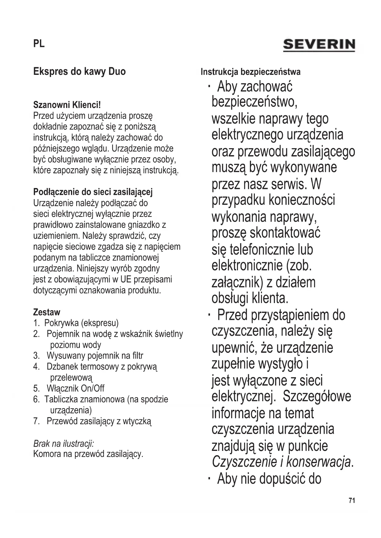 Ekspres do kawy Duo Szanowni Klienci! Przedużyciemurządzeniaproszę dokładniezapoznaćsięzponiższą instrukcją,którąnależyzachowaćdo późniejszegowglądu.Urządzeniemoże byćobsługiwanewyłącznieprzezosoby, którezapoznałysięzniniejsząinstrukcją. Podłączenie do sieci zasilającej Urządzenienależypodłączaćdo siecielektrycznejwyłącznieprzez prawidłowozainstalowanegniazdkoz uziemieniem.Należysprawdzić,czy napięciesieciowezgadzasięznapięciem podanym na tabliczce znamionowej urządzenia.Niniejszywyróbzgodny jestzobowiązującymiwUEprzepisami dotyczącymioznakowaniaproduktu. Zestaw