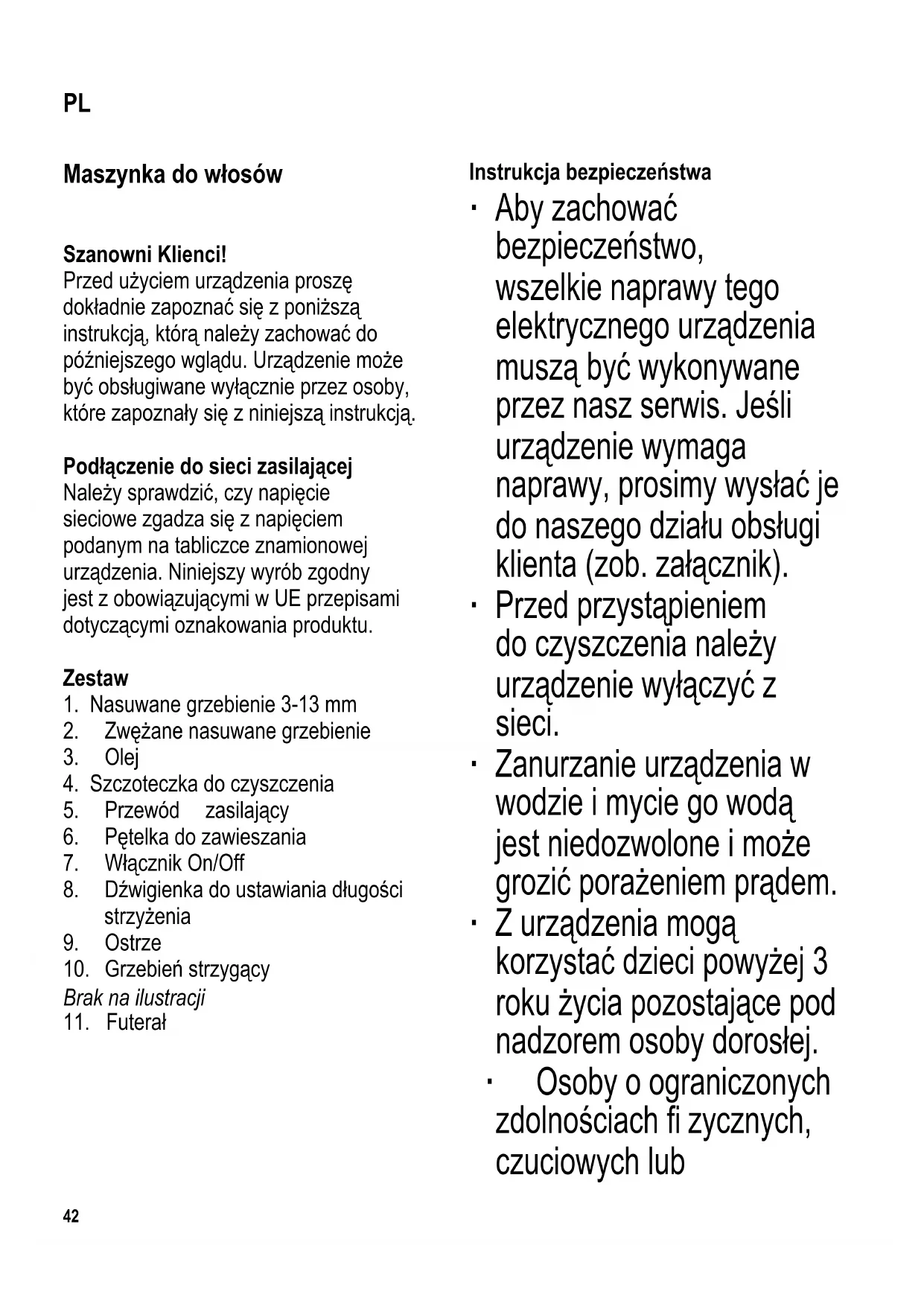 Instrukcja bezpieczeństwa ∙ Aby zachować bezpieczeństwo, wszelkie naprawy tego elektrycznego urządzenia muszą być wykonywane przez nasz serwis. Jeśli urządzenie wymaga naprawy, prosimy wysłać je do naszego działu obsługi klienta (zob. załącznik). ∙ Przed przystąpieniem do czyszczenia należy urządzenie wyłączyć z sieci. ∙ Zanurzanie urządzenia w wodzie i mycie go wodą jest niedozwolone i może grozić porażeniem prądem. ∙ Z urządzenia mogą korzystać dzieci powyżej 3 roku życia pozostające pod nadzorem osoby dorosłej. ∙ Osoby o ograniczonych zdolnościach fi zycznych, czuciowych lub PL43 psychicznych albo nieposiadające stosownego doświadczenia lub wiedzy, a także dzieci (w wieku co najmniej 8 lat), mogą korzystać z urządzenia, pod warunkiem że znajdują się pod nadzorem lub zostały poinstruowane, jak używać urządzenia i są w pełni świadome wszelkich zagrożeń i wymaganych środków ostrożności. ∙ Nie dopuszczać do używania urządzenia jako zabawki przez dzieci. ∙ Ani czyszczenie, ani konserwacja nie mogą być wykonywane przez dzieci bez nadzoru osoby dorosłej. ∙ Nie dopuszczać do urządzenia i jego przewodu zasilającego dzieci poniżej 3 lat. ∙ Uwaga: Nie pozwalać, aby dzieci miały dostęp do elementów opakowania, ponieważ mogą one spowodować zagrożenie, np. uduszenia. ∙ Uwaga: Nie używać urządzenia w pobliżu wanny lub umywalki napełnionej wodą albo innego pojemnika z wodą. ∙ Uwaga: Należy chronić urządzenie przed wilgocią i nie dotykać go mokrymi rękami. ∙ Jeżeli urządzenie używane jest w łazience, obecność wody stanowi zagrożenie, nawet kiedy urządzenie jest wyłączone. Dlatego po zakończeniu czynności należy zawsze wyjąć wtyczkę z kontaktu. Dodatkową ochronę stanowi założenie w instalacji domowej automatycznego bezpiecznika prądu upływowego do 30 mA. Proszę poradzić się wykwalifi kowanego elektryka. ∙ Przed użyciem urz ądzenia należy dokładnie sprawdzić, czy główny korpus i wszystkie elementy czynnościowe są sprawne i nie noszą śladów uszkodzenia. Jeżeli urządzenie spadło na twardą powierzchnię, nie nadaje się do dalszego użytku, gdyż nawet najmniejsza, niewidoczna usterka powstała z tego powodu, może mieć ujemny wpływ na jego działanie i bezpieczeństwo użytkownika. ∙ Wtyczkę należy wyjąć z gniazdka elektrycznego każdorazowo po zakończeniu pracy oraz: - w przypadku stwierdzenia usterki urządzenia;44 - i przed przystąpieniem do czyszczenia. ∙ Nigdy nie należy ciągnąć za przewód przy wyjmowaniu wtyczki z gniazdka. ∙ Uwaga! Ostrze jest bardzo ostre. Aby zapobiec zranieniu, należy uważać, aby w trakcie korzystania z urządzenia ostrze nigdy nie wchodziło w bezpośredni kontakt ze skórą. ∙ Pracującego urządzenia nie należy pozostawiać bez nadzoru. ∙ Za szkody wynikłe z nieprawidłowego używania sprzętu lub użytkowania niezgodnego z instrukcją obsługi odpowiedzialność ponosi wyłącznie użytkownik. ∙ Nie stosować urządzenia na zwierzętach domowych i innych. Korzystanie z urządzenia Precyzyjna regulacja długości strzyżenia Dźwigienka do ustawiania d ługości strzyżenia umożliwia precyzyjną regulację w przedziale około 1 – 1,6 mm nawet w trakcie strzyżenia. Nasuwane grzebienie Nasuwane grzebienie znajdujące się w zestawie poszerzają zakres długości strzyżenia. Nałożyć żądany grzebień na głowicę przycinającą, wsuwając pewnym ruchem aż się zatrzaśnie na swoim miejscu. Po użyciu odblokować grzebień z tyłu i wysunąć go. Grzebienie 3 – 13 mm Nasadki umożliwiają strzyżenie na długość 3, 6, 9 albo 13 mm. Zwężane grzebienie Zwężane grzebienie służą do strzyżenia włosów w sposób umożliwiający uniknięcie efektu „schodków”. Dzięki niej włosy przy uszach są krócej przycinane niż włosy w okolicy czubka głowy. Obsługa ∙ W łosy powinny być czyste i dobrze rozczesane. ∙ Do dłuższych fryzur stosować nakładany grzebień lub grzebień normalny. ∙ Strzyżenie zaczynać zawsze od największego nasuwanego grzebienia. Dzięki temu zyskuje się lepsze wyczucie co do uzyskania zamierzonego efektu. ∙ Do krótszych fryzur należy następnie