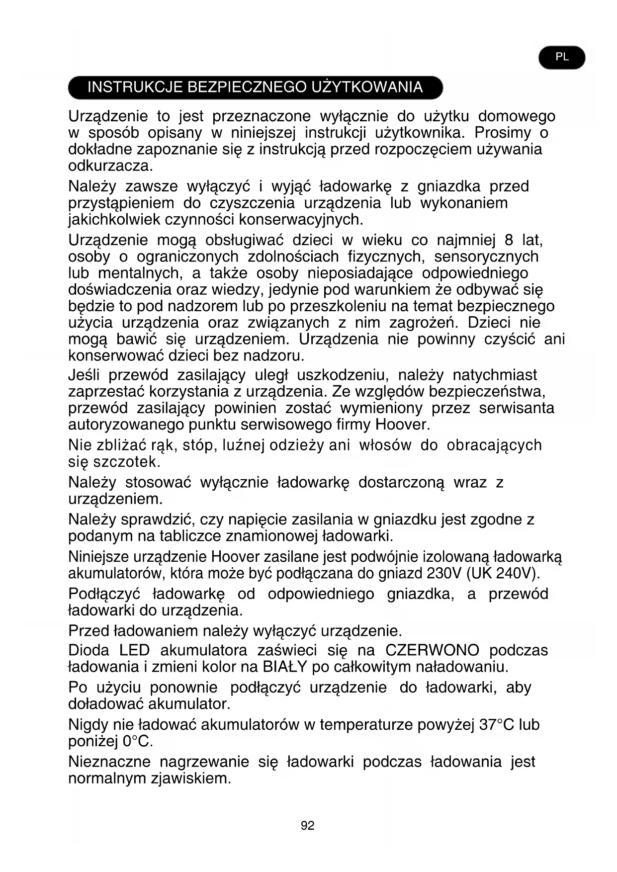 Urządzenie to jest przeznaczone wyłącznie do użytku domowego w sposób opisany w niniejszej instrukcji użytkownika. Prosimy o dokładne zapoznanie się z instrukcją przed rozpoczęciem używania odkurzacza. Należy zawsze wyłączyć i wyjąć ładowarkę z gniazdka przed przystąpieniem do czyszczenia urządzenia lub wykonaniem jakichkolwiek czynności konserwacyjnych. Urządzenie mogą obsługiwać dzieci w wieku co najmniej 8 lat, osoby o ograniczonych zdolnościach fizycznych, sensorycznych lub mentalnych, a także osoby nieposiadające odpowiedniego doświadczenia oraz wiedzy, jedynie pod warunkiem że odbywać się będzie to pod nadzorem lub po przeszkoleniu na temat bezpiecznego użycia urządzenia oraz związanych z nim zagrożeń. Dzieci nie mogą bawić się urządzeniem. Urządzenia nie powinny czyścić ani konserwować dzieci bez nadzoru. Jeśli przewód zasilający uległ uszkodzeniu, należy natychmiast zaprzestać korzystania z urządzenia. Ze względów bezpieczeństwa, przewód zasilający powinien zostać wymieniony przez serwisanta autoryzowanego punktu serwisowego firmy Hoover. Nie zbliżać rąk, stóp, luźnej odzieży ani włosów do obracających się szczotek. Należy stosować wyłącznie ładowarkę dostarczoną wraz z urządzeniem. Należy sprawdzić, czy napięcie zasilania w gniazdku jest zgodne z podanym na tabliczce znamionowej ładowarki. Niniejsze urządzenie Hoover zasilane jest podwójnie izolowaną ładowarką akumulatorów, która może być podłączana do gniazd 230V (UK 240V). Podłączyć ładowarkę od odpowiedniego gniazdka, a przewód ładowarki do urządzenia. Przed ładowaniem należy wyłączyć urządzenie. Dioda LED akumulatora zaświeci się na CZERWONO podczas ładowania i zmieni kolor na BIAŁY po całkowitym naładowaniu. Po użyciu ponownie podłączyć urządzenie do ładowarki, aby doładować akumulator. Nigdy nie ładować akumulatorów w temperaturze powyżej 37°C lub poniżej 0°C. Nieznaczne nagrzewanie się ładowarki podczas ładowania jest normalnym zjawiskiem. PL93 NIE wyjmować wtyczki ładowarki z gniazdka, ciągnąc za przewód zasilający. W razie dłuższej nieobecności (urlop itp.) odłączyć ładowarkę od zasilania. Po dłuższej przerwie w eksploatacji urządzenie należy doładować przed użyciem, ponieważ bezczynność powoduje rozładowanie akumulatorów. Jeżeli urządzenie ma być złomowane, należy z niego najpierw usunąć akumulatory. Podczas wyjmowania akumulatora urządzenie musi być odłączone od zasilania. Akumulatory należy utylizować w sposób bezpieczny dla środowiska. Włączyć urządzenie i pozwolić, aby pracowało aż do całkowitego wyczerpania akumulatorów. Zużyte akumulatory należy przekazać do recyklingu. Nie należy ich wyrzucać ze śmieciami domowymi. W celu wyjęcia akumulatorów należy skontaktować się z Centrum Serwisowym Hoover lub postępować zgodnie z następującymi instrukcjami. WAŻNE: Przed usunięciem należy całkowicie rozładować akumulatory. Włączyć odkurzacz i pozwolić, aby pracował aż do pełnego wyczerpania akumulatorów. Wyjąć wtyczkę przewodu ładowarki z urządzenia. Naciśnij przyciski zwalniające zestaw baterii i wysuń go. Uwaga: W razie napotkania jakichkolwiek problemów z demontażem jednostki lub w razie konieczności uzyskania dodatkowych informacji na temat sposobu utylizacji, złomowania i recyklingu urządzenia należy skontaktować się z lokalnym urzędem gminy lub komunalnym zakładem utylizacji odpadów. Należy korzystać wyłącznie z końcówek, materiałów eksploatacyjnych oraz części zamiennych zalecanych lub dostarczonych przez firmę Hoover. Ładunki elektrostatyczne: odkurzanie niektórych dywanów może powodować niewielkie naelektryzowanie się urządzenia. Tego rodzaju ładunki elektrostatyczne nie stanowią zagrożenia dla zdrowia. Nie używać urządzenia na zewnątrz domu, do odkurzania mokrych powierzchni ani do zbierania wody. Nie wolno wciągać twardych lub ostrych przedmiotów, zapałek, gorącego popiołu, niedopałków papierosów ani innych podobnych przedmiotów. Nie spryskiwać łatwopalnymi cieczami, środkami czyszczącymi w aerozolu ani parą. Nie stąpać po przewodzie zasilającym podczas korzystania z urządzenia i nie wyjmować wtyczki, ciągnąc za przewód zasilający. Nie wolno kontynuować eksploatacji uszkodzonego urządzenia lub ładowarki.