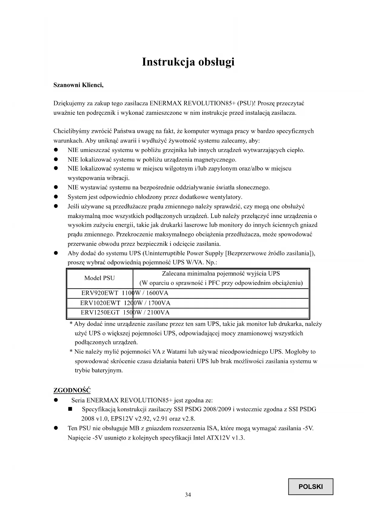 - Nie należy mylić pojemności VA z Watami lub używać nieodpowiedniego UPS. Mogłoby to spowodować skrócenie czasu działania baterii UPS lub brak możliwości zasilania systemu w trybie bateryjnym. ZGODNOŚĆ Seria ENERMAX REVOLUTION85+ jest zgodna ze: Specyfikacją konstrukcji zasilaczy SSI PSDG 2008/2009 i wstecznie zgodna z SSI PSDG 2008 v1.0, EPS12V v2.92, v2.91 oraz v2.8. Ten PSU nie obsługuje MB z gniazdem rozszerzenia ISA, które mogą wymagać zasilania -5V. Napięcie -5V usunięto z kolejnych specyfikacji Intel ATX12V v1.3. POLSKI35