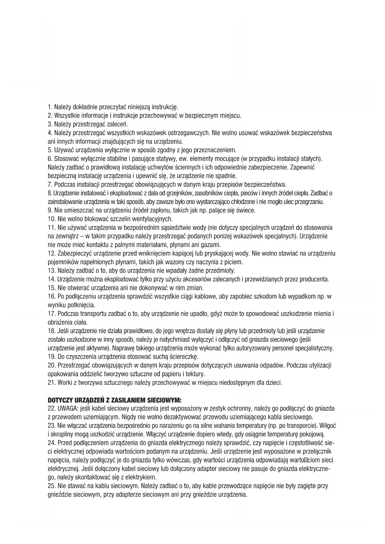 22. UWAGA: jeśli kabel sieciowy urządzenia jest wyposażony w zestyk ochronny, należy go podłączyć do gniazda