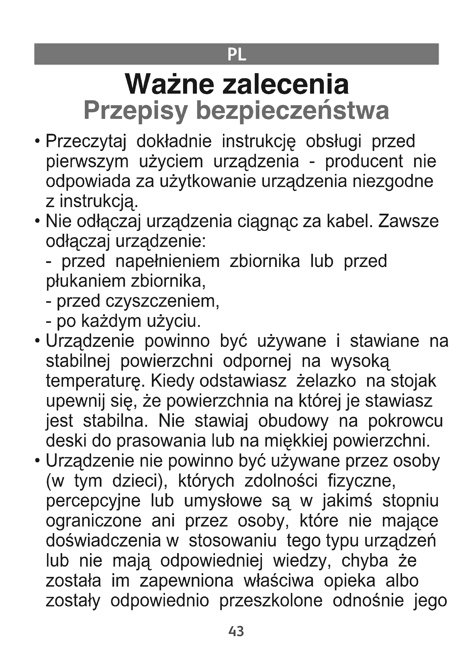 - Urządzenie nie powinno być używane przez osoby (w tym dzieci), których zdolności fizyczne, percepcyjne lub umysłowe są w jakimś stopniu ograniczone ani przez osoby, które nie mające doświadczenia w stosowaniu tego typu urządzeń lub nie mają odpowiedniej wiedzy, chyba że została im zapewniona właściwa opieka albo zostały odpowiednio przeszkolone odnośnie jego