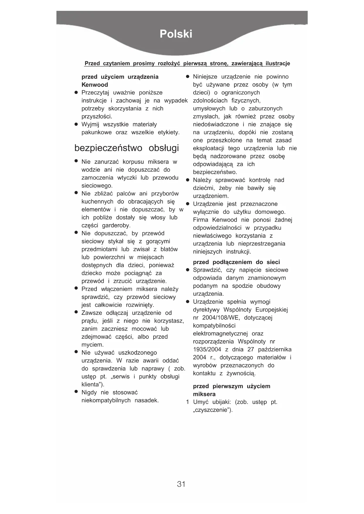 Urządzenie spełnia wymogi dyrektywy Wspólnoty Europejskiej nr 2004/108/WE, dotyczącej kompatybilności elektromagnetycznej oraz rozporządzenia Wspólnoty nr 1935/2004 z dnia 27 października 2004 r., dotyczącego materiałów i wyrobów przeznaczonych do kontaktu z żywnością. przed pierwszym użyciem miksera 1 Umyć ubijaki: (zob. ustęp pt. „czyszczenie”). Polski
