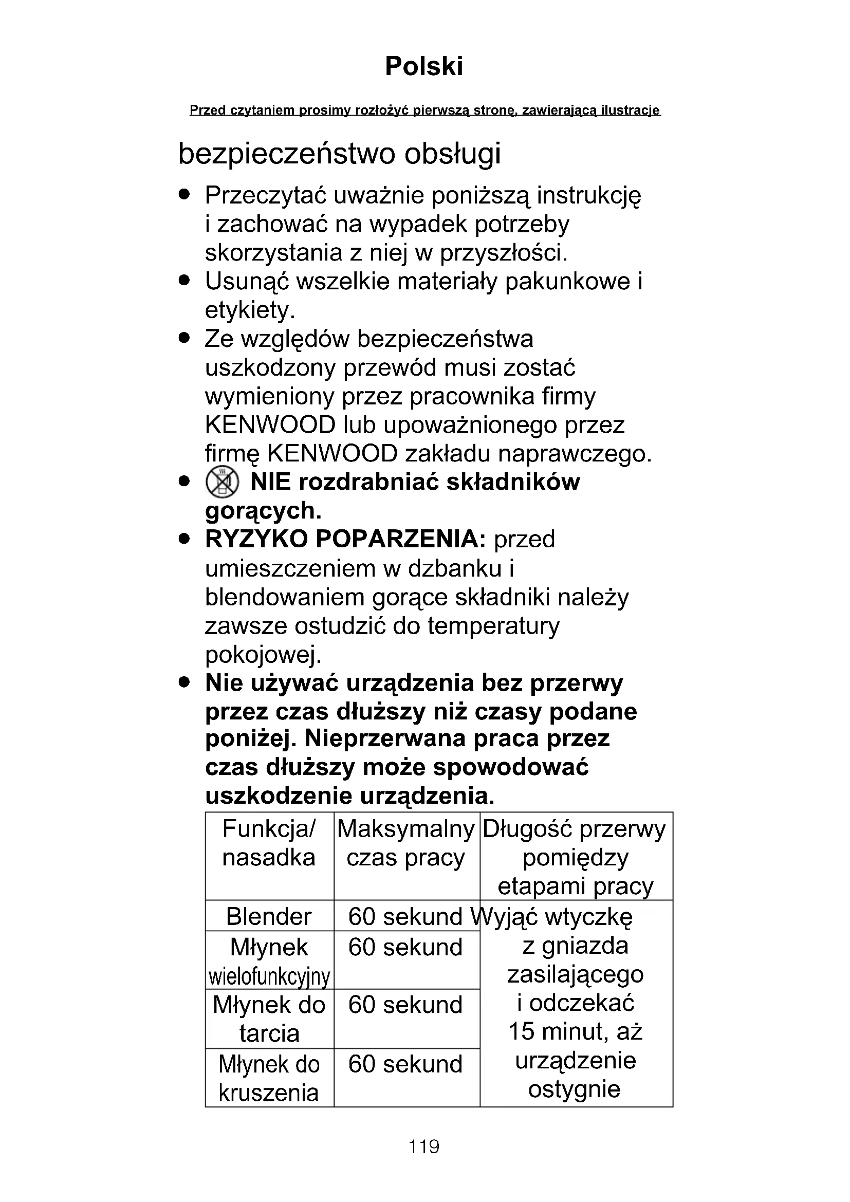 Nie używać urządzenia bez przerwy przez czas dłuższy niż czasy podane poniżej. Nieprzerwana praca przez czas dłuższy może spowodować uszkodzenie urządzenia. Funkcja/ nasadka Maksymalny czas pracy Długość przerwy pomiędzy etapami pracy Blender 60 sekund Wyjąć wtyczkę z gniazda zasilającego i odczekać 15 minut, aż urządzenie ostygnie Młynek wielofunkcyjny 60 sekund Młynek do tarcia 60 sekund Młynek do kruszenia 60 sekund Polski Przed czytaniem prosimy roz¢o¯yç pierwszå stronë, zawierajåcå ilustracje119 120