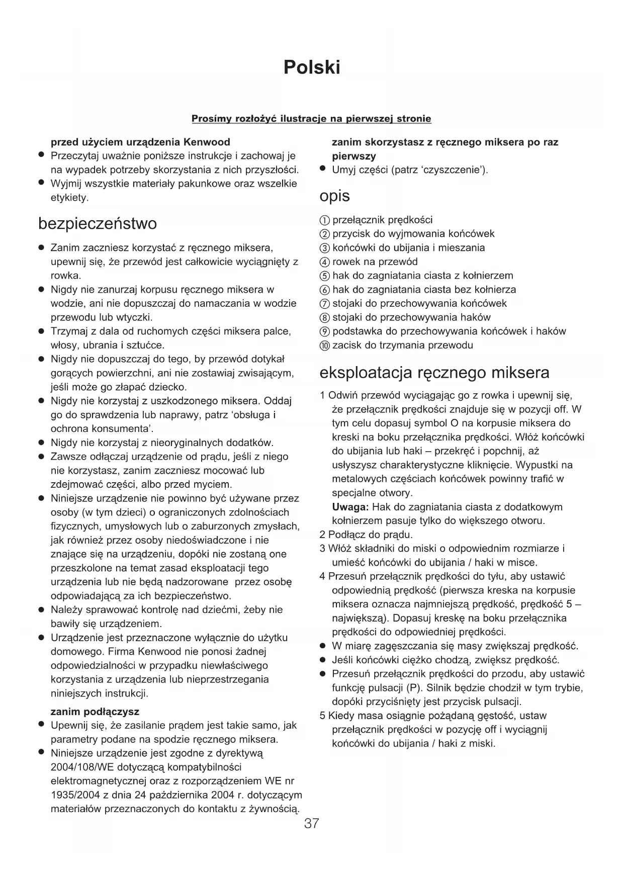 Niniejsze urządzenie jest zgodne z dyrektywą 2004/108/WE dotyczącą kompatybilności elektromagnetycznej oraz z rozporządzeniem WE nr 1935/2004 z dnia 24 października 2004 r. dotyczącym materiałów przeznaczonych do kontaktu z żywnością. zanim skorzystasz z ręcznego miksera po raz pierwszy