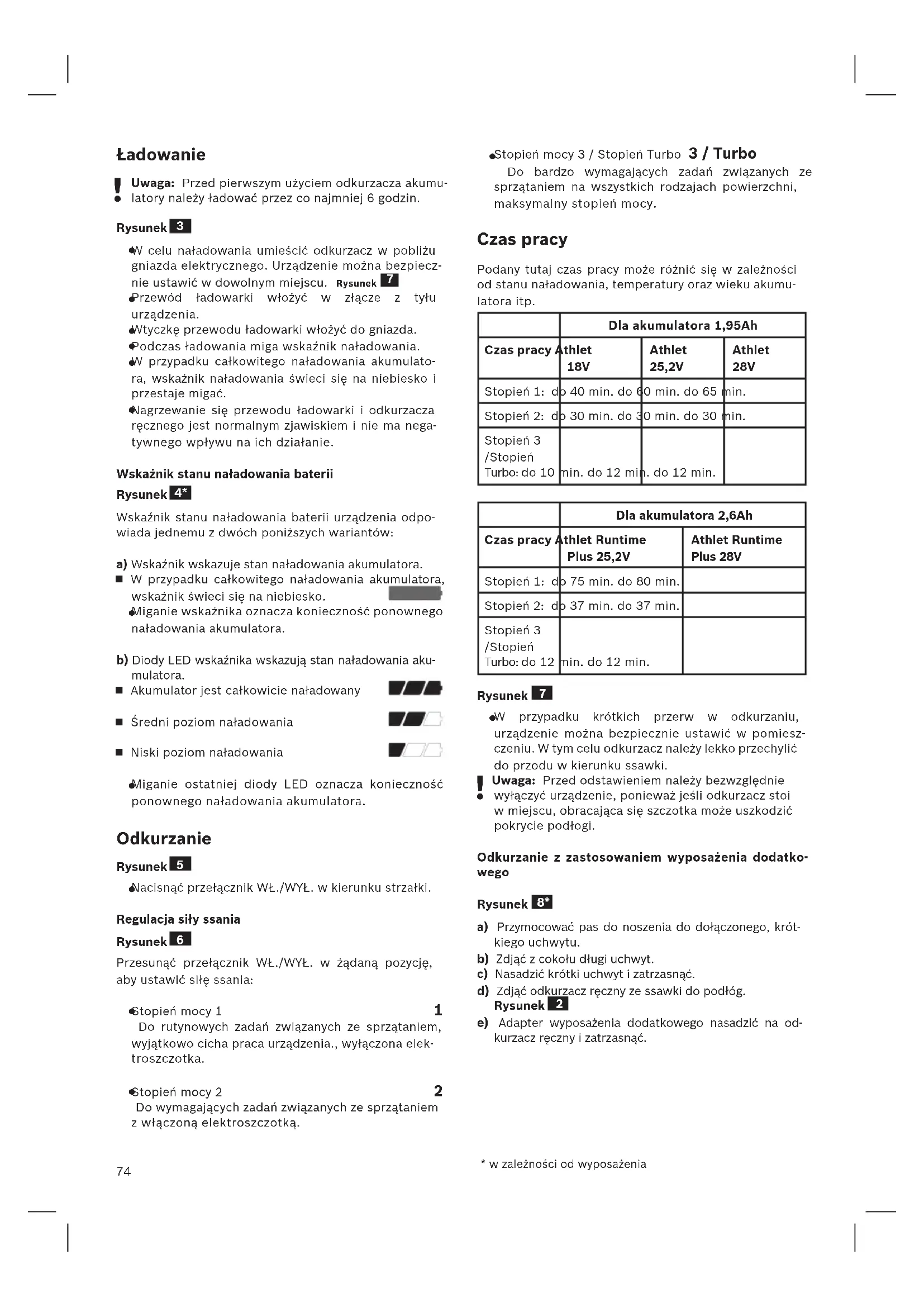 Stopień mocy 3 / Stopień Turbo 3 / Turbo Do bardzo wymagających zadań związanych ze sprzątaniem na wszystkich rodzajach powierzchni, maksymalny stopień mocy. Czas pracy Podany tutaj czas pracy może różnić się w zależności od stanu naładowania, temperatury oraz wieku akumu- latora itp. Dla akumulatora 1,95Ah Czas pracy Athlet 18V Athlet 25,2V Athlet 28V Stopień 1: do 40 min. do 60 min. do 65 min. Stopień 2: do 30 min. do 30 min. do 30 min. Stopień 3 /Stopień Turbo: do 10 min. do 12 min. do 12 min. Dla akumulatora 2,6Ah Czas pracy Athlet Runtime Plus 25,2V Athlet Runtime Plus 28V Stopień 1: do 75 min. do 80 min. Stopień 2: do 37 min. do 37 min. Stopień 3 /Stopień Turbo: do 12 min. do 12 min. Rysunek