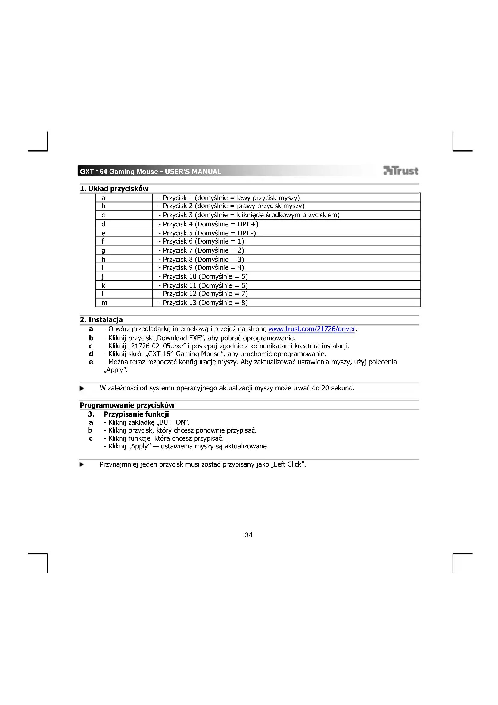 - Otwórz przeglądarkę internetową i przejdź na stronę www.trust.com/21726/driver. - Kliknij przycisk „Download EXE”, aby pobrać oprogramowanie. - Kliknij „21726-02_05.exe” i postępuj zgodnie z komunikatami kreatora instalacji. - Kliknij skrót „GXT 164 Gaming Mouse”, aby uruchomić oprogramowanie. - Można teraz rozpocząć konfigurację myszy. Aby zaktualizować ustawienia myszy, użyj polecenia „Apply”. W zależności od systemu operacyjnego aktualizacji myszy może trwać do 20 sekund. Programowanie przycisków