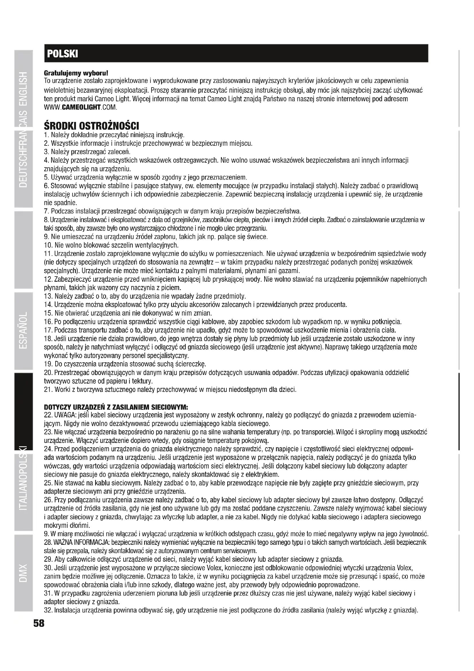 To urzadzenie zostalo zaprojektowane i wyprodukowane przy zastosowaniuj najwyzszych kryteriow jakosciych w celu zapewnienia wieloletnej bezawarynej eksploatacji. Prosze starannie przyczetyac niniejsza instrukcje obslugi, aby moc jak najszybciej zaczac uzytkowac ten produkt marki Cameo Light. Wiecej informaci na temat Cameo Light znajda Paanstwo na naszej stronie internetowej pod adresm WWW.CAMEOLIGHT.COM.