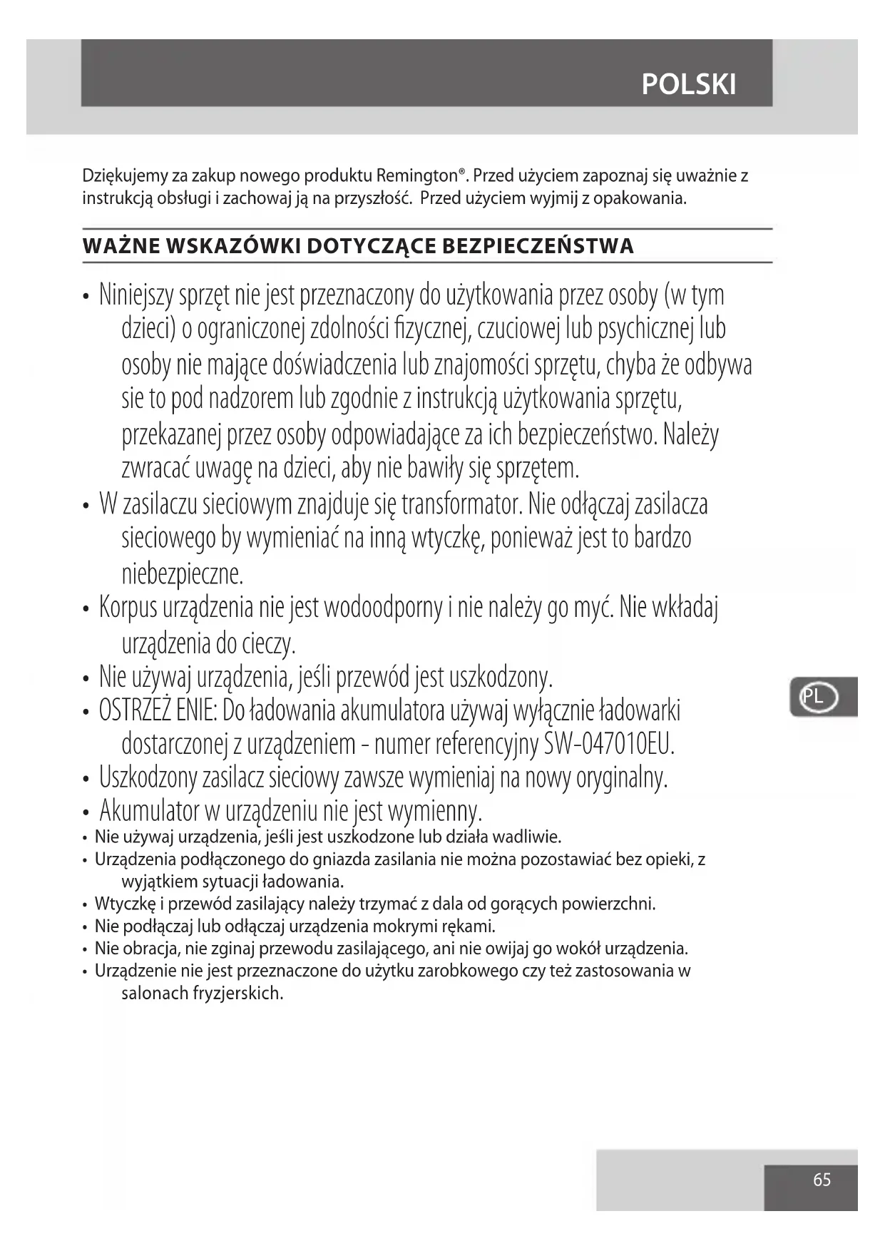 - Urządzenie nie jest przeznaczone do użytku zarobkowego czy też zastosowania w salonach fryzjerskich. POLSKI