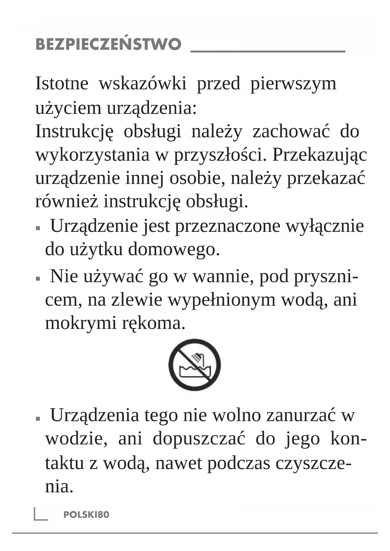 Urządzenia tego nie wolno zanurzać w wodzie, ani dopuszczać do jego kon- taktu z wodą, nawet podczas czyszcze- nia.POLSKI 81 BEZPIECZEŃSTWO __________________