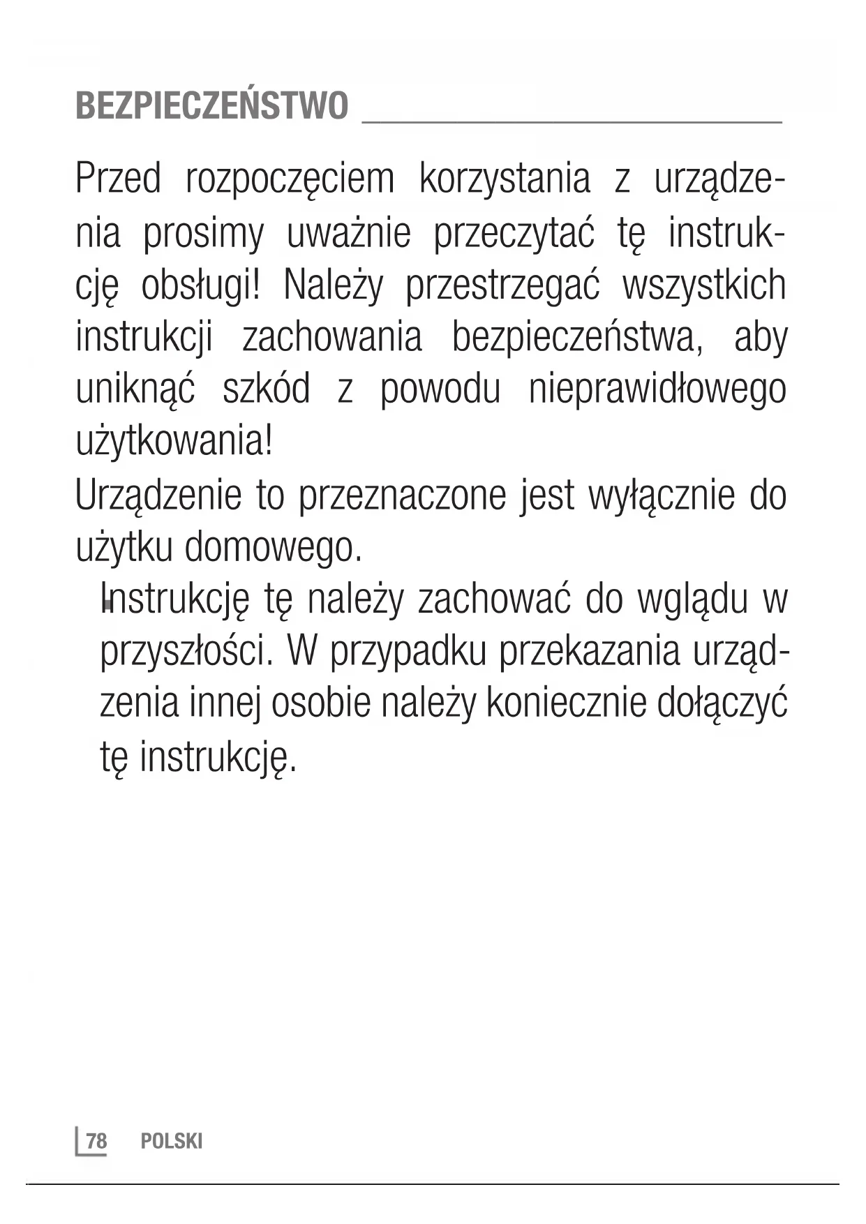 BEZPIECZEŃSTWO ______________________ Przed rozpoczęciem korzystania z urządze- nia prosimy uważnie przeczytać tę instruk- cję obsługi! Należy przestrzegać wszystkich instrukcji zachowania bezpieczeństwa, aby uniknąć szkód z powodu nieprawidłowego użytkowania! Urządzenie to przeznaczone jest wyłącznie do użytku domowego.